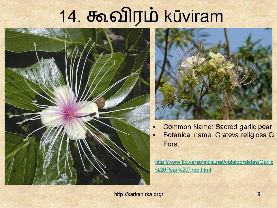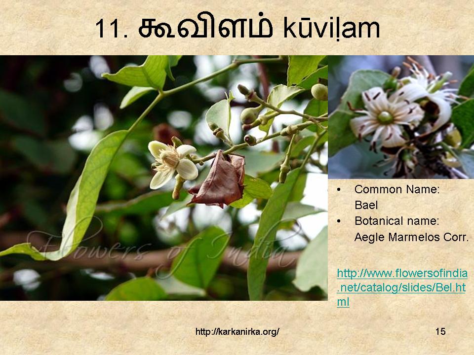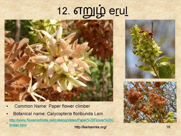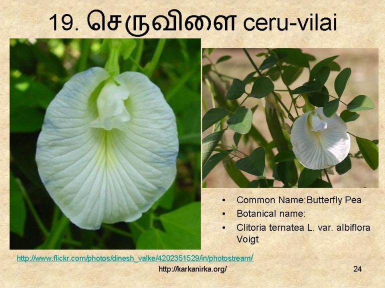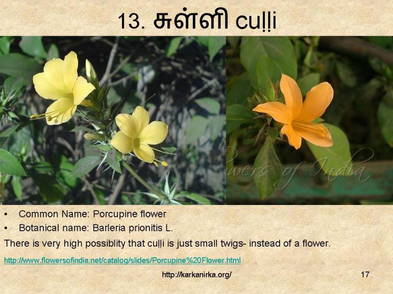 I had a longtime doubt on one Andaal’s poem in Nachiar Thirumozhi where she mention about suLLi (No.13th flower), but actually she meant சுள்ளி means small sticks for burning.