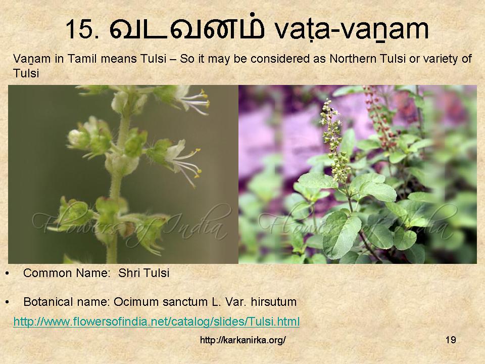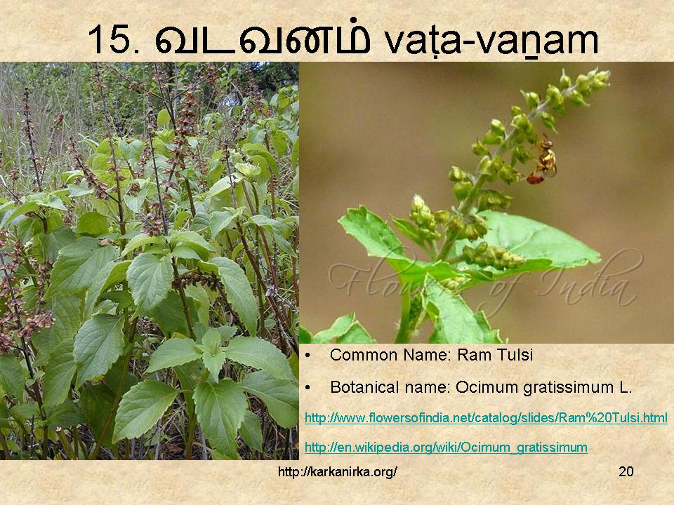 Vanam is identified as either tuḷaci, Ocimum sanctum or kuḻimiṭṭāṉ, Ocimum sanctum hirsutum. Ocimum sanctum hirsutum, variety of Ocimum sanctum, might be proper identification since tuḷaci figures in the list(tulay). Sami interprets vadavanam as northern tuḷaci and identifies it as ram tuḷaci – ocimum gratissimum.