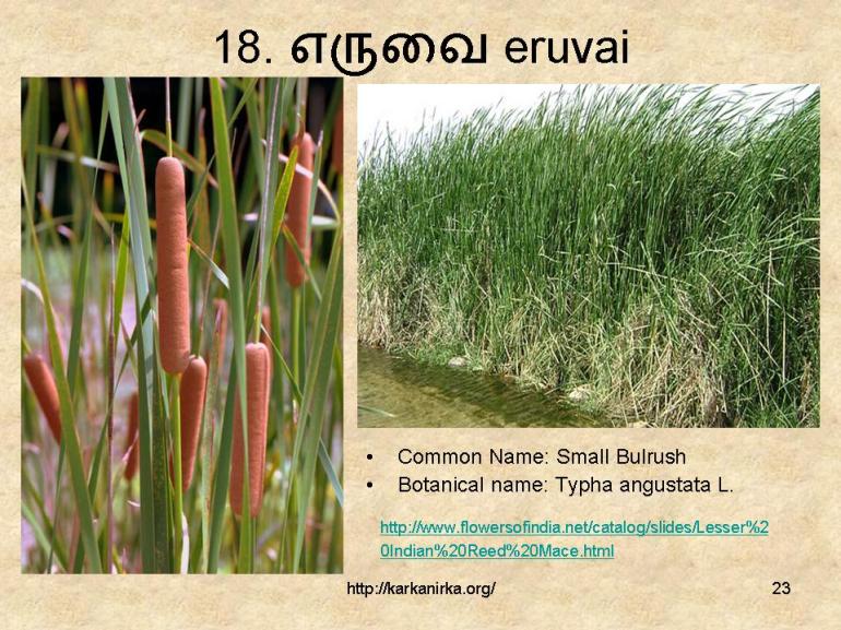 Eruvai has been identified as kōrai by Naccinarkiniyar.Sami identifies eruvai in line with some old commentary to be bulrush variety, Typha angustata.