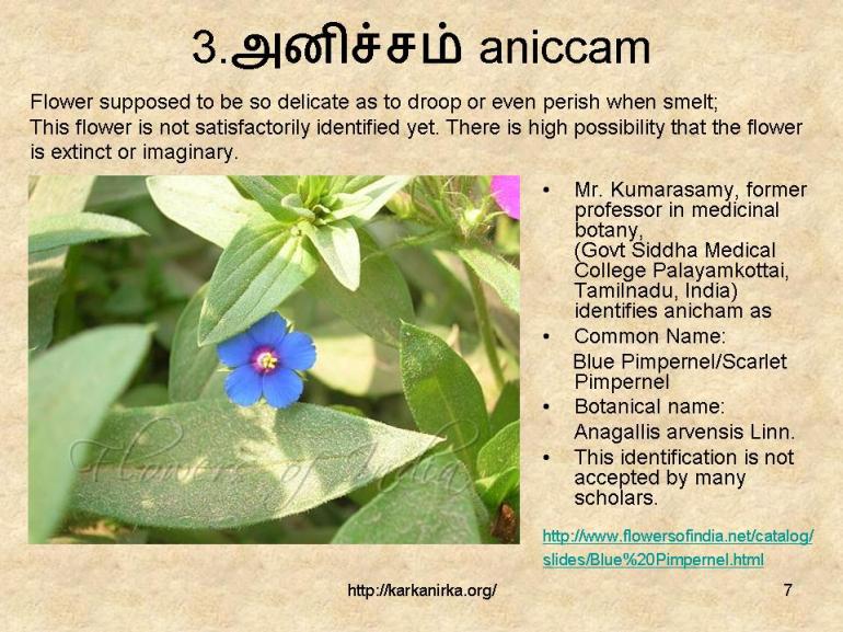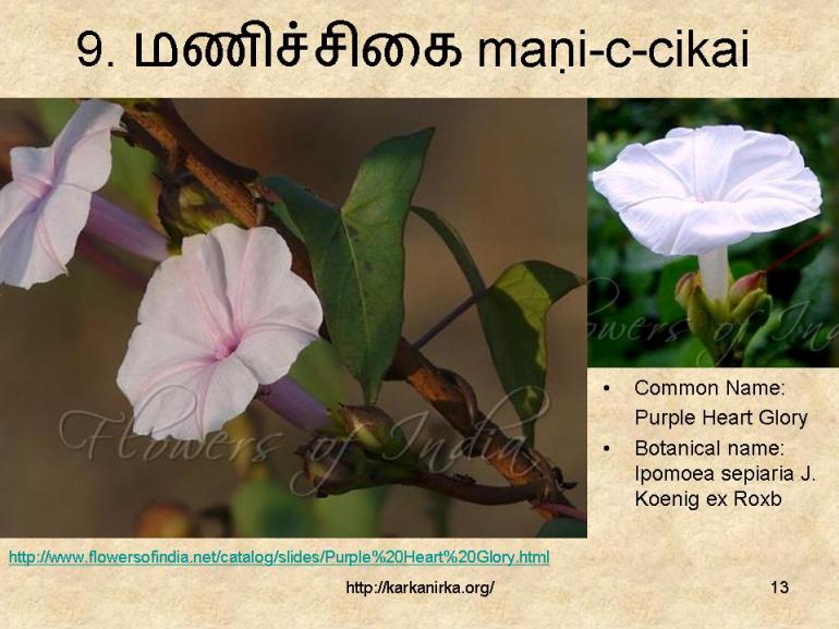 Maṇiccikai is identified as kuṉṟi by TL but since kuṉṟi also figures in the list later this identification doesn’t seem appropriate. Sami has identified as Ipomea Sepiaria. Tamil Lexicon identifies this flower as mañcikai. In Sanskrit this flower is known as manjika.