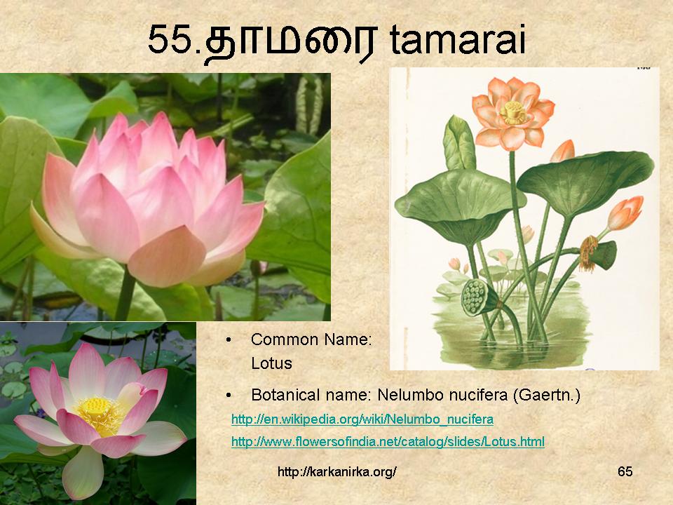 , n. < tāmarasa. 1. Lotus, Nelumbium speciosum;