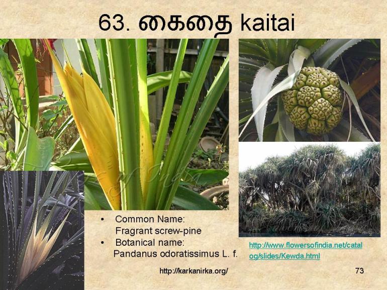 Flower No.63 Kaithai – The picture shown is of Thalampoo commonly known in Tamil Nadu. The petal are with much good smell. Ordinarily it it is used to adorn pigtails of ladies. This flower is forbidden to god-worship. There is a story about it. Once, between Lord Vishnu and Bramma a quarrel arise and to settle it they approached Lord Eswar and He stood gigantic and asked them to reach his feet and crown. Vishnu took Varaha shape (Pig) and dig towards feet and Bramma took bird shape and flew towards crown (head). As Bramma cannot reach the head, he asked the thalampoo which was falling from the head, to lie that Bramma reached the head and they both are on return journey to earch. As the Thalampoo has given false witness, Lord Eswar forbided it and ordered not to use it for worship or pooja. And such a depiction can be seen every Sivan temple at the back side of the Sanctum Sanctorium and the sculpture is called as LINGOTHBAVAR. This is for information of readers.