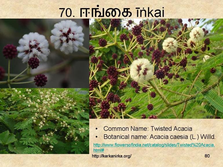 Īnkai is identified as Mimosa rubicaulis by Lexicon. And Sami identifies a similar species Mimosa torta (synonyms of acacia caesia mentioned in his paper). Mimosa torta seems to be right identification since Mimosa rubicaulis has habitat of Himalayas and is not natural to Tamil Nadu.