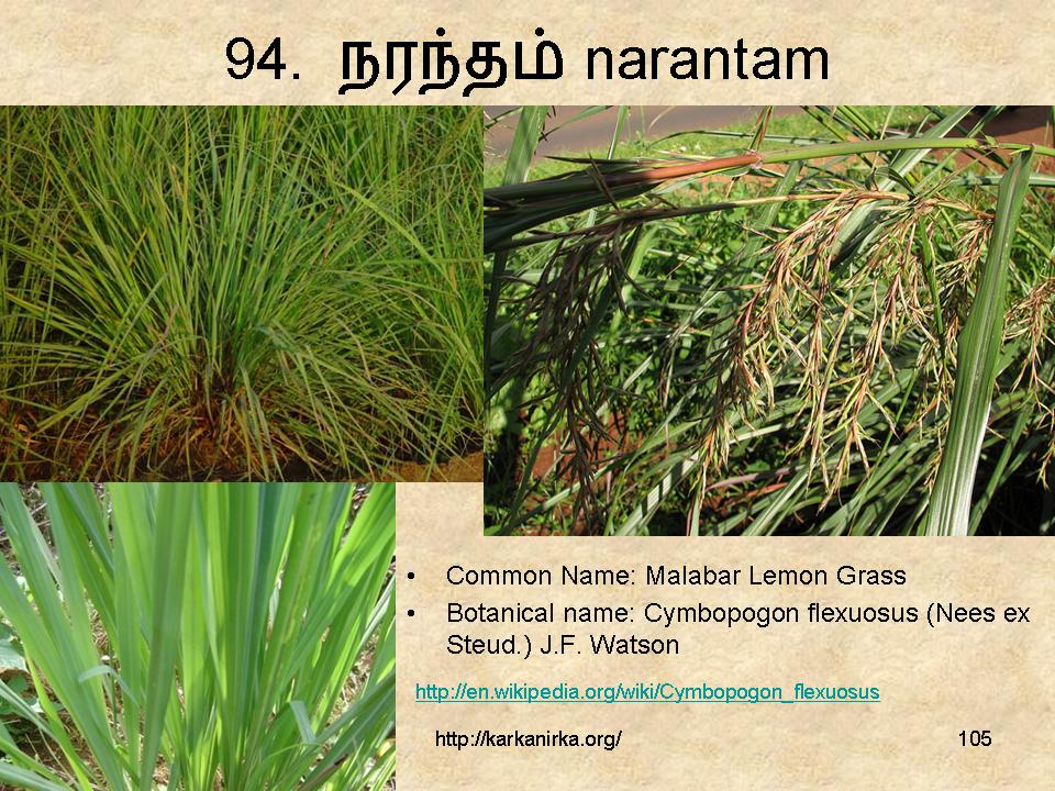 Flower No. 99 – Pulagu – It is a common waste land plant growing in discarded waste lands. This flower is dedicated particularly to Lord Ganapathi or Vinayagar. The central bulb portion are used make garland to the Lord. The thick root are used to carve idol of Ganapathi and use such idols for domestic worships. This is for information of readers.