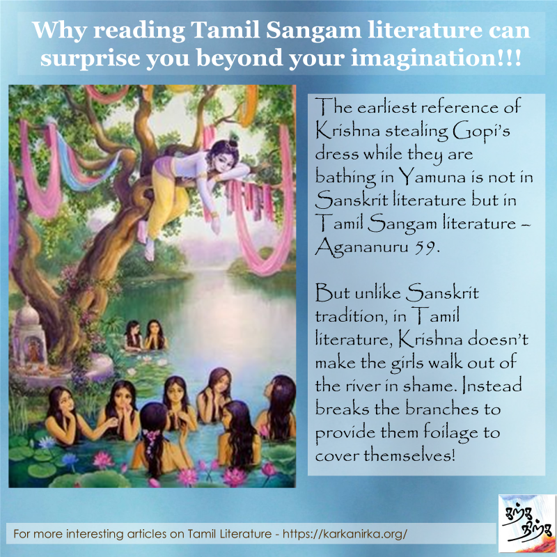 Reading Sangam literature can always throw you some pleasant surprises. This is one of such surprise. Krishna stealing Gopika’s dress while they were bathing in Yamuna, is absent in any of Sanskrit litertaure before 5th century and the earliest available literature for the theme is available only in Sangam literature. Below lines for Agananooru are the earliest available lines on this motif. The poem is written by Nallantuvanar.