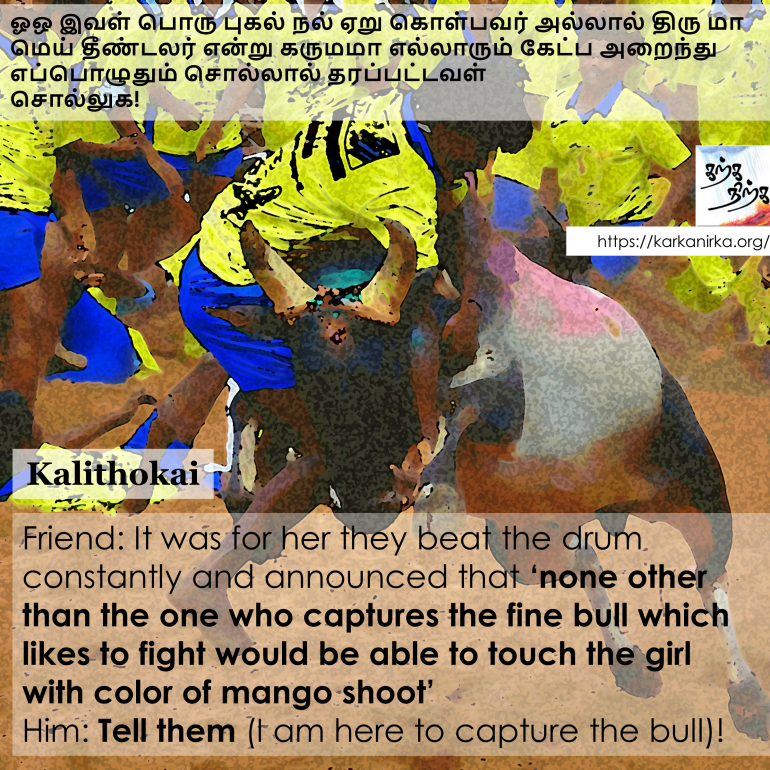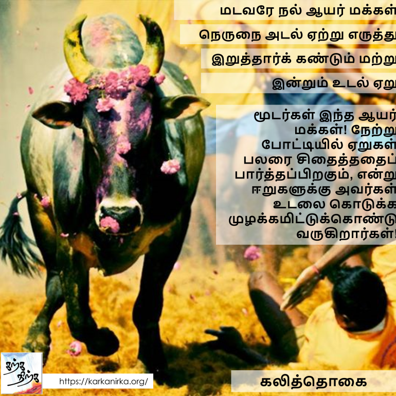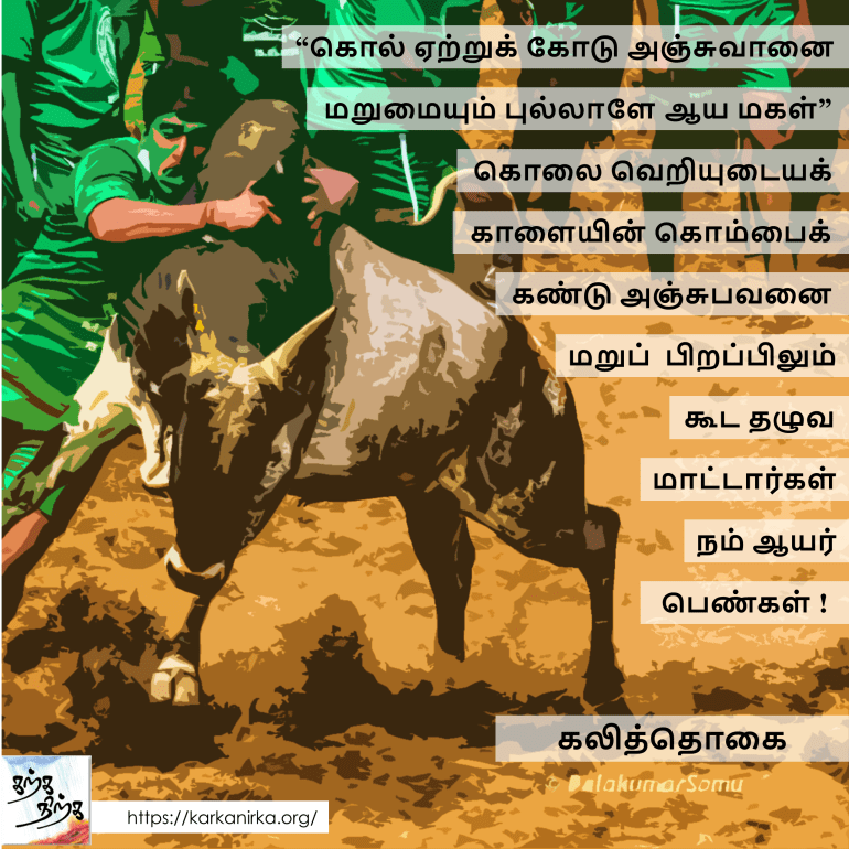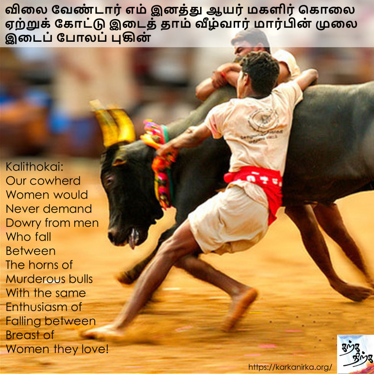 The connection to Jallikattu is not very clear. Please remember cow domestication and rounding up others’ cows for thieving was common in the olden Tamil country. Hence this poem could refer to cow thieves or those who round up wild cows for domestication. Whether bull running as it is done today was existing in those times unchanged is debatable. Let’s take credit only for genuine history and leave hype to the masses