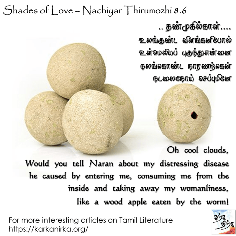 Wood Apple – Vilam Pazham is hard outside and mushy inside. It is good food for worms, as the mushy fruit inside is easy to consume. All it needs to do is make a small hole to enter inside. For onlooker if he misses the small whole, it would appear the same as other fruits, but it has been consumed inside. Similarly she says Mal has entered her and taken away her soul/womanliness away. Though she appears like a normal girl, she is love sick inside and hence sends cloud as the messenger to Mal.