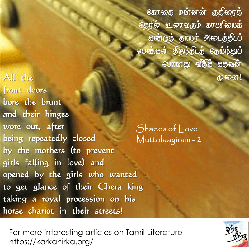 Mothers were afraid that the daughters would fall into love with who they cannot attain (king wont marry every girl who falls in love with him!) and eventually waste their lives in love sickness. But the girls just can’t avoid not seeing him (its like Maddy after Alaipayuthe walking your street and your mother is not allowing you to see him!). So the mom closes the door and daughter opens it up, Moms sees the door open and closed it. But the girl opens it up again. This goes on and on till the king passes by and literally the door is damaged! What an imagination!