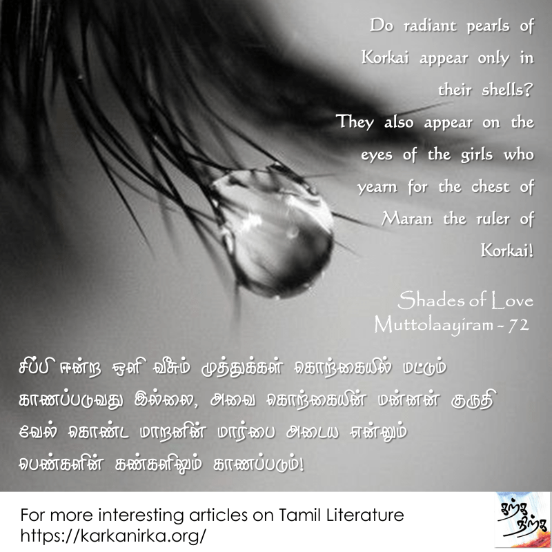 Girls are in love with their King. But they do realize he is unattainable. Result of their love just tears. Korkai pearls were renowned world wide and was imported by Greeks and Romans to shower their luxury on their lady love.