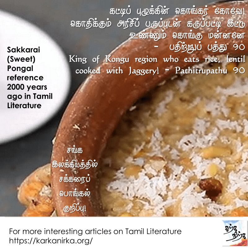 Here is the specific reference to Sakkarai Pongal /Sweet Pongal in Sangam literature [Around 150-200 AD].