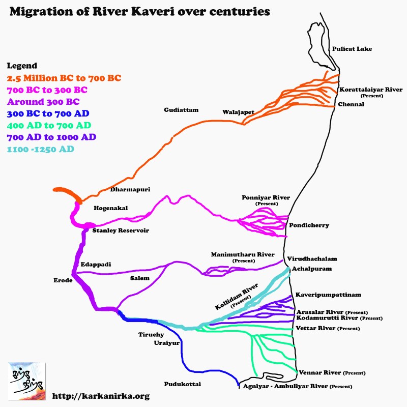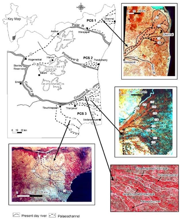 Paleo Channels imaged through GIS show that Kaveri river met present day Palar channel and flowed in North Easterly direction from the Hogenakkal via Chinnar. Palakodu, Mattur, Tiruppathur , Gudiyatham , Vellore and Walajapet to meet the sea at Madras. Around 700 BC Kaveri abandoned this course. Today Covum, Adayar, Koratalayar, Kosthalaiyar flow in this basin which was once occupied by Kaveri and later by Palar.
