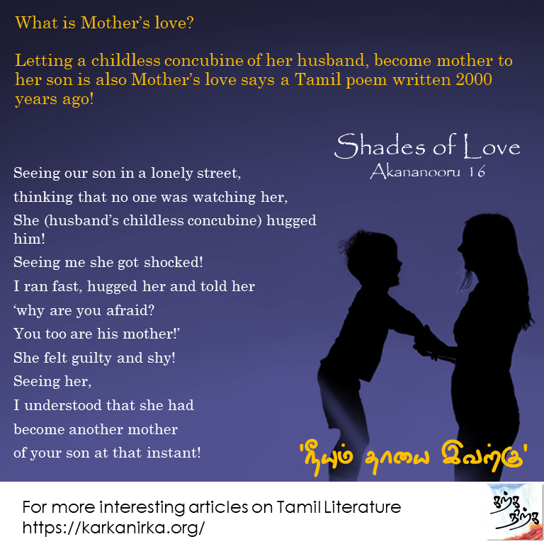 One beautiful poem on the Mother’s day. The very reason why I like Sangam literature. Poem speak about eternal love, universal love. Not love just between lovers, husband and wife, paretns and kids, but love even between a wife and her husband’s other women. One empathizing even with her worst competitor. Being a mother makes you empthaize for a women who is childless. Being a mother here Heroine lets her husband’s childless concubine become a mother to her child. What more great love you can quote than this one?