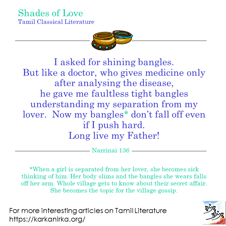 One of the beautiful verses from Tamil classical literature Narrinai. The Girl thinks that her father is wise man who understand the pains and crisis of the girl. She wishes her father may live long because he understands his daughter well.
