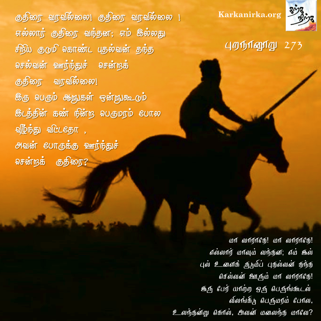 புறநானூறு 273, பாடியவர்: எருமை வெளியனார், திணை: தும்பை, துறை: குதிரை மறம்