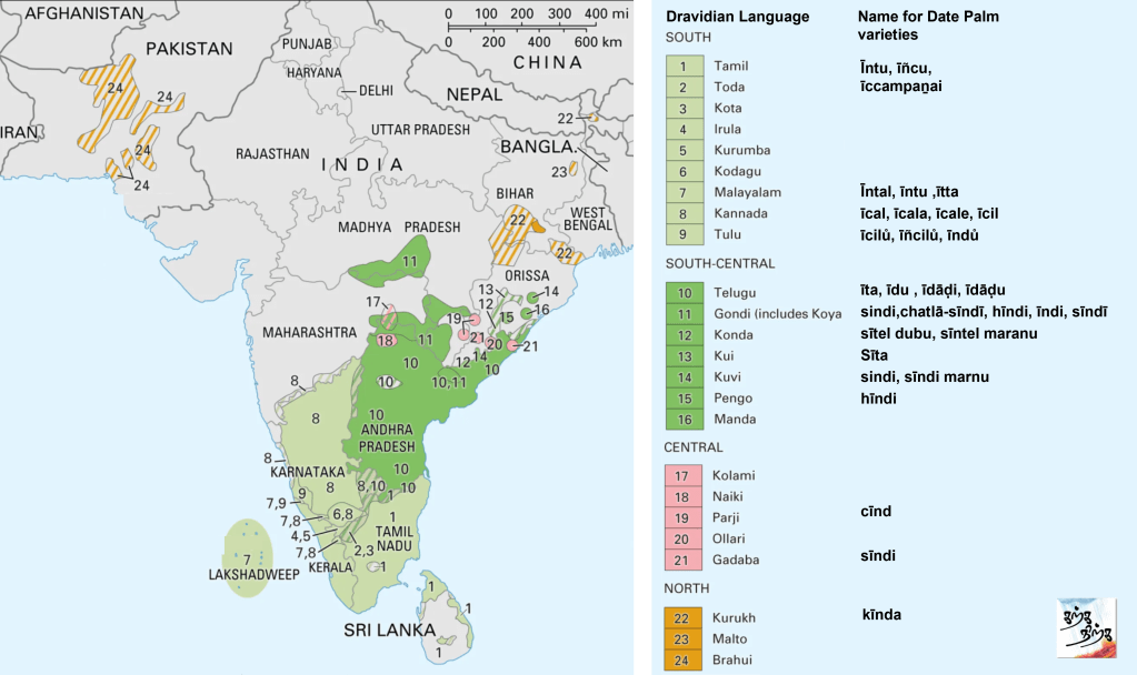 Prof. Franklin Southworth has reconstructed the Early Proto Dravdian version of the word for dates as Kīntu or cīntu and later Proto Dravidian version as cīntu (pronounced as sindu/cindu).[7]