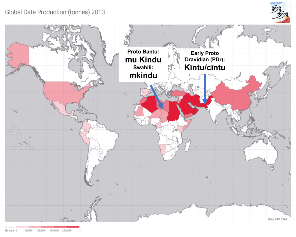 He quotes Nurse’s proto Bantu reconstruction of term for date as ‘mu Kindu’ being similar to proto Dravidian version. Nurse’s paper reconstructs the proto Bantu version from present day Northern and Southern dialects of Swahili (mkindu – dates) [9]