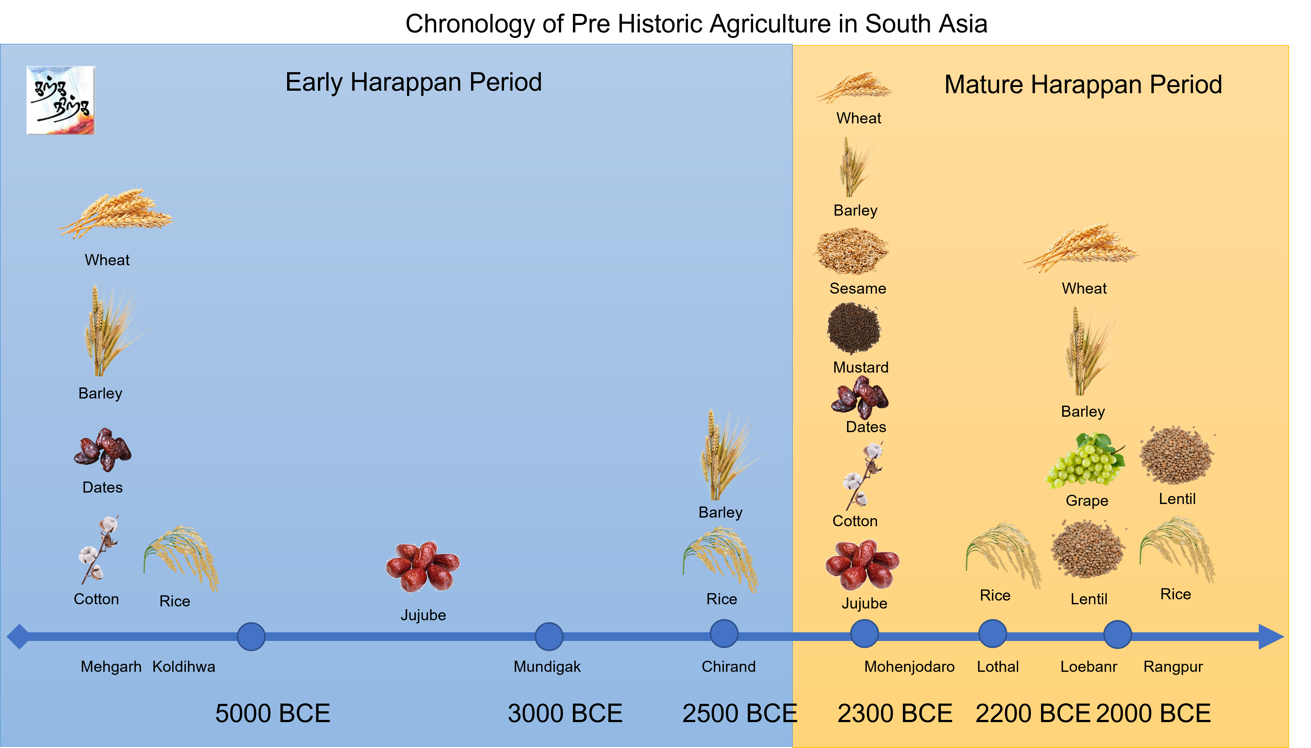 Excavations in Mehrgarh have show evidence of earliest settled agriculture in South Asia. There is evidence of cultivation of wheat, barley and dates pre 5000 BCE. [1]. Also in Mature Harappa phase around 2500 BCE, we have evidence of Dates cultivation in Harappa and Mohenjo-Daro [2].