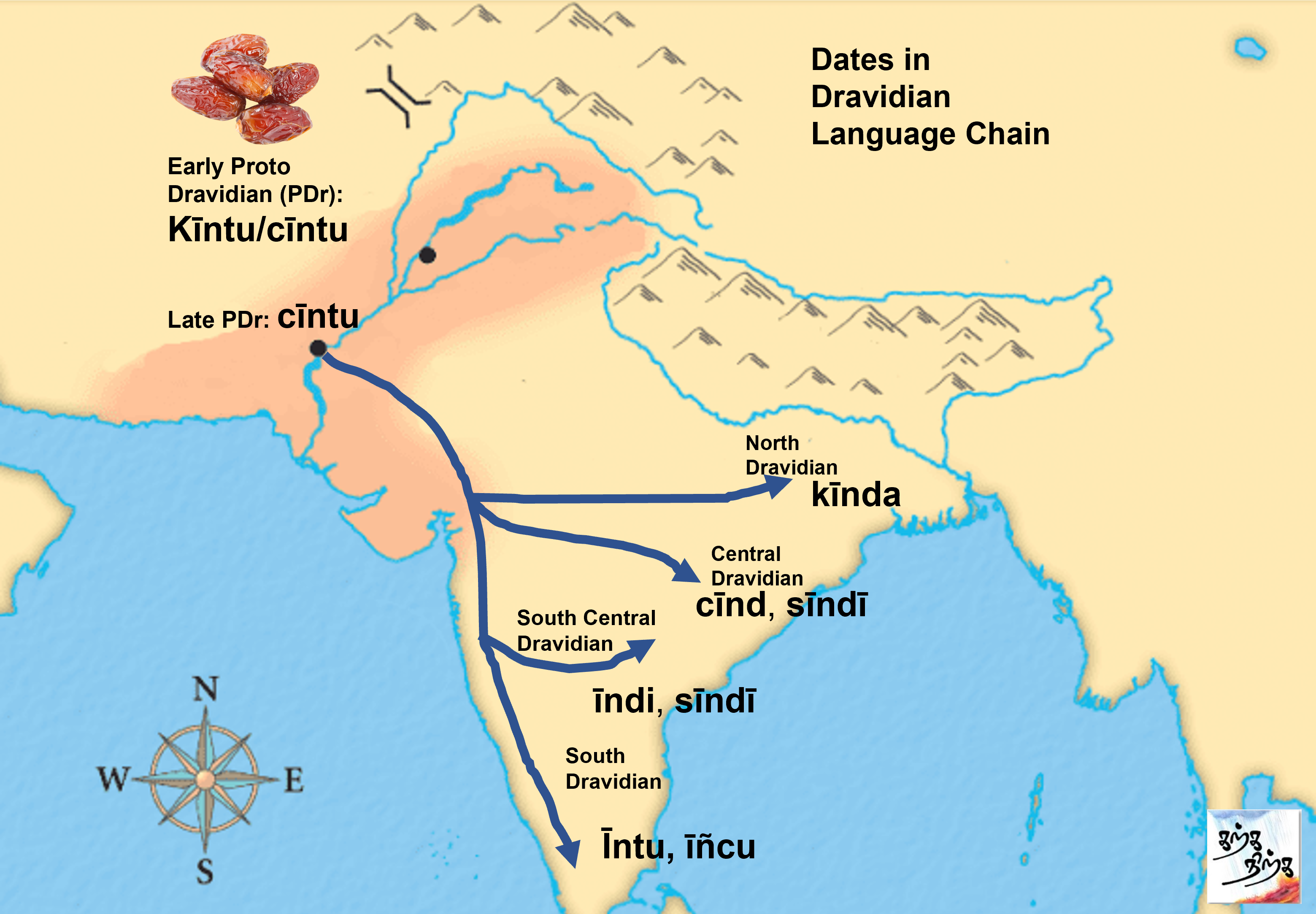 Prof. Franklin Southworth has reconstructed the Early Proto Dravdian version of the word for dates as Kīntu or cīntu and later Proto Dravidian version as cīntu (pronounced as sindu/cindu).[7]