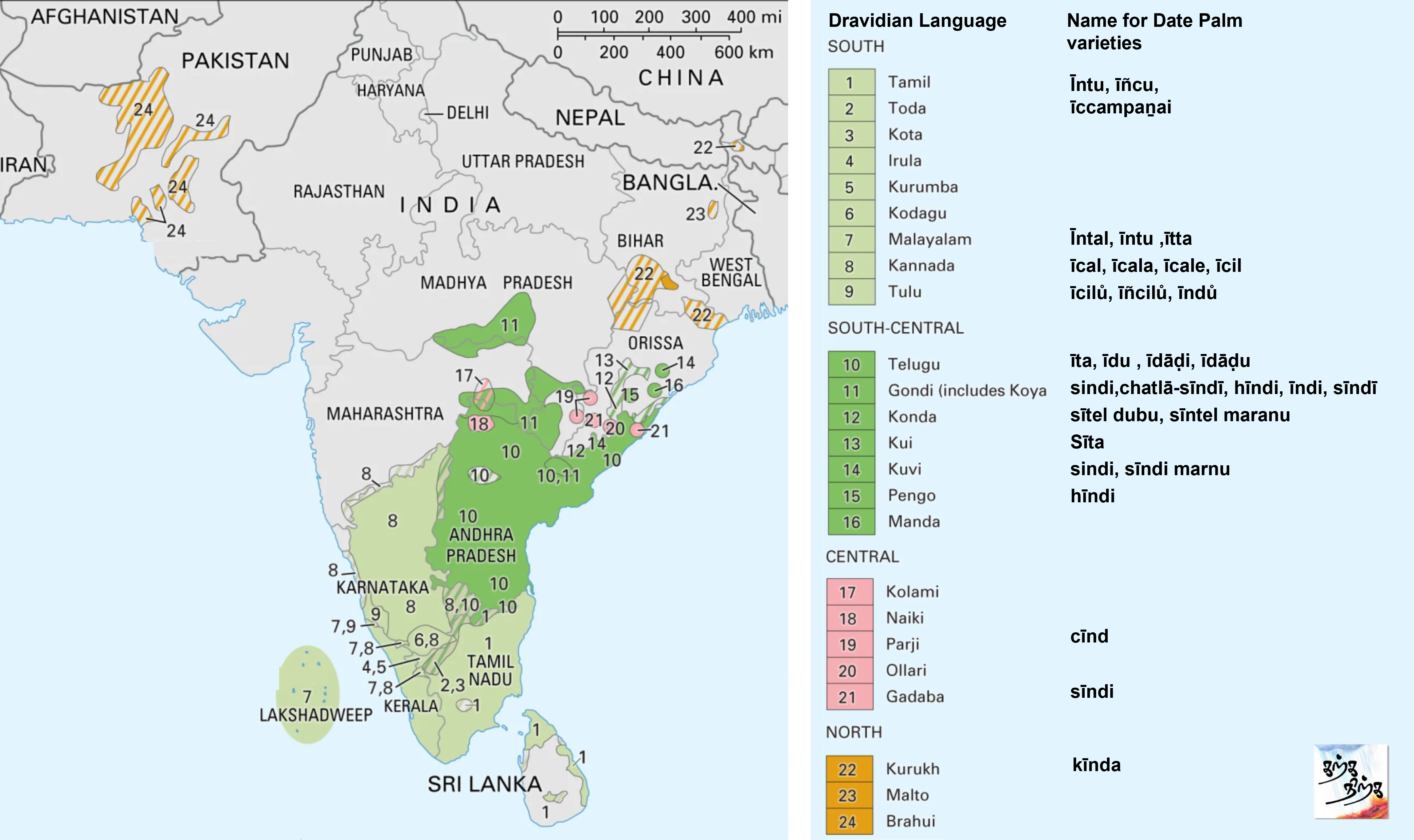 Per Southworth, Dravidian language chain has the earliest word for dates, pre dating Munda and Indo Aryan Languages. [8]