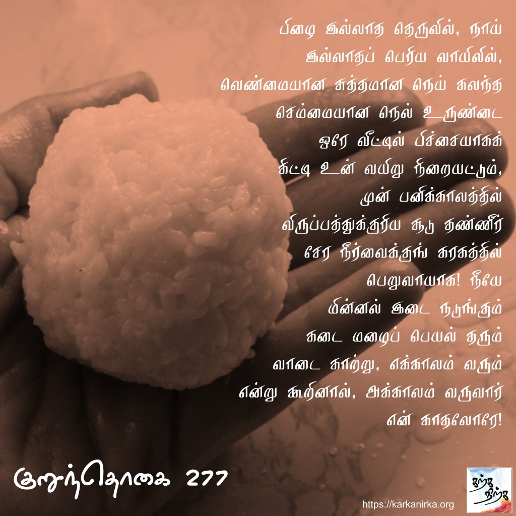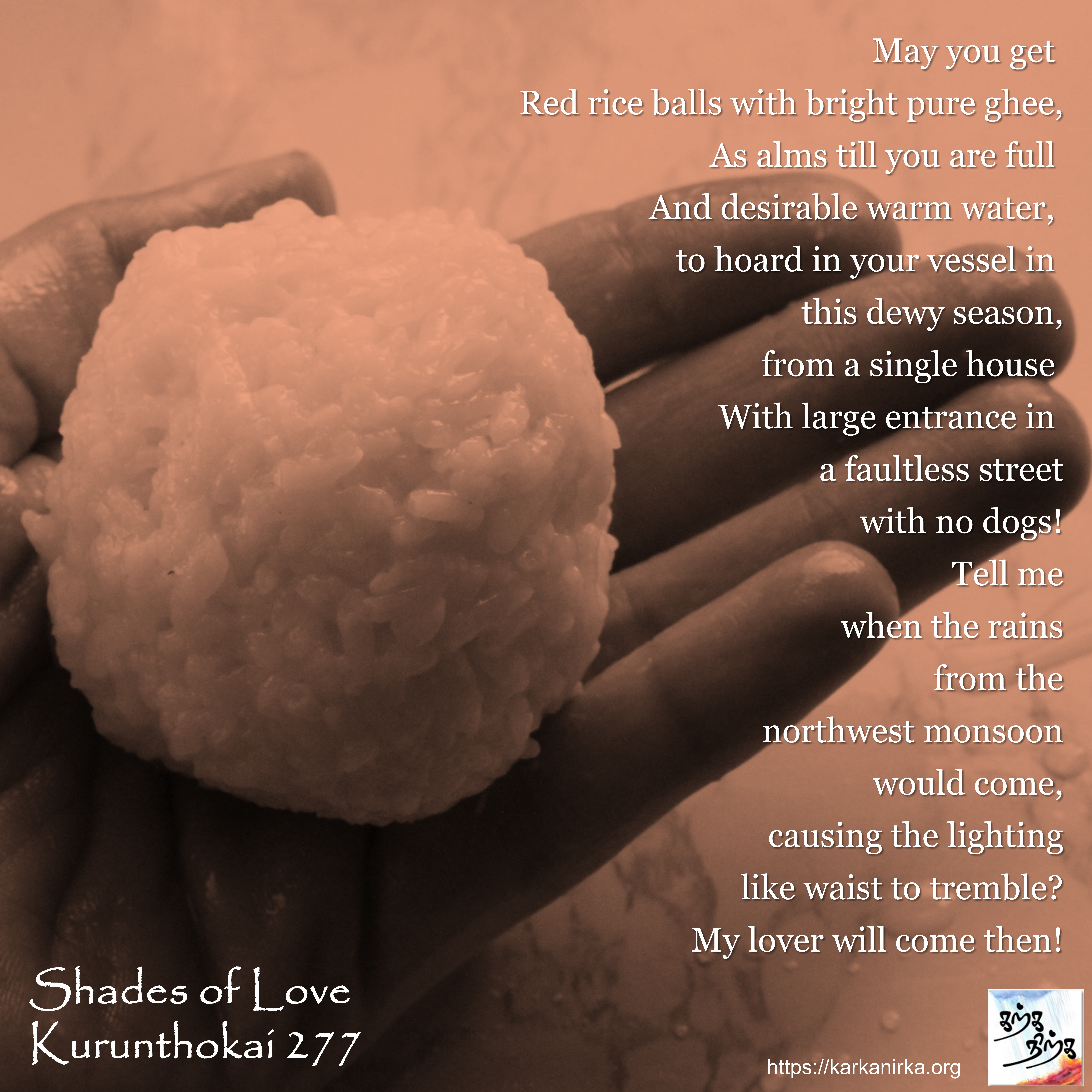 Thalaivi (Heroine) is awaiting for the North East monsoon to begin and is asking a soothsayer/Wisemen/ Beggar who is well versed with astronomy (star movements) to tell her when the North east monsoon will arrive and she wishes him that he gets most delicious of food as alms. Full poem below.