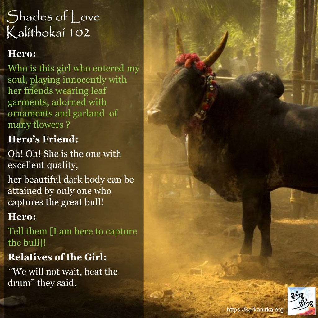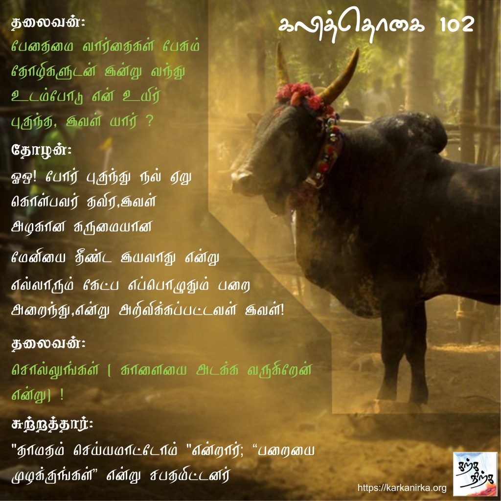 Note: Kalithokai is late Sangam, technically not Sangam but tagged to Sangam. These poems may be 400 to 600 CE. These set of Mullai poems are key to prove that Jallikattu or Aru Thaluval is traditional Tamil sport.