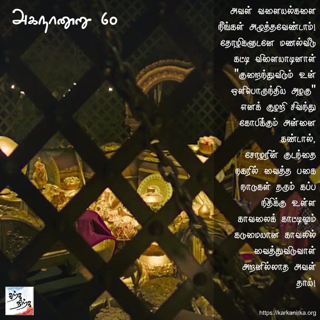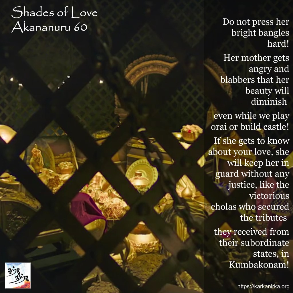 Situation: Thalaivan (hero) and Thalaivi (heroine) are meeting each other secretly with help of Panki (friend of Thalaivi). Thalaivan is too romantically involved and Panki warns him that if their mother gets to know about Thalaivi’s affair she will lock her in the house like how Cholas lock their tribute in Kudavayil (Kumbakonam). Interestingly for people who have seen Ponniyin Selvan movie, they would have seen a scene where Vandhiyathevan (Karthi) actually stumbles by Chola’s treasury locked in a cage. The poem interesting notes that barter price of pound of salt is pound of white rice. Also Aayirai – Mackerel kolambu was popular dish 2000 years back (still is!).
