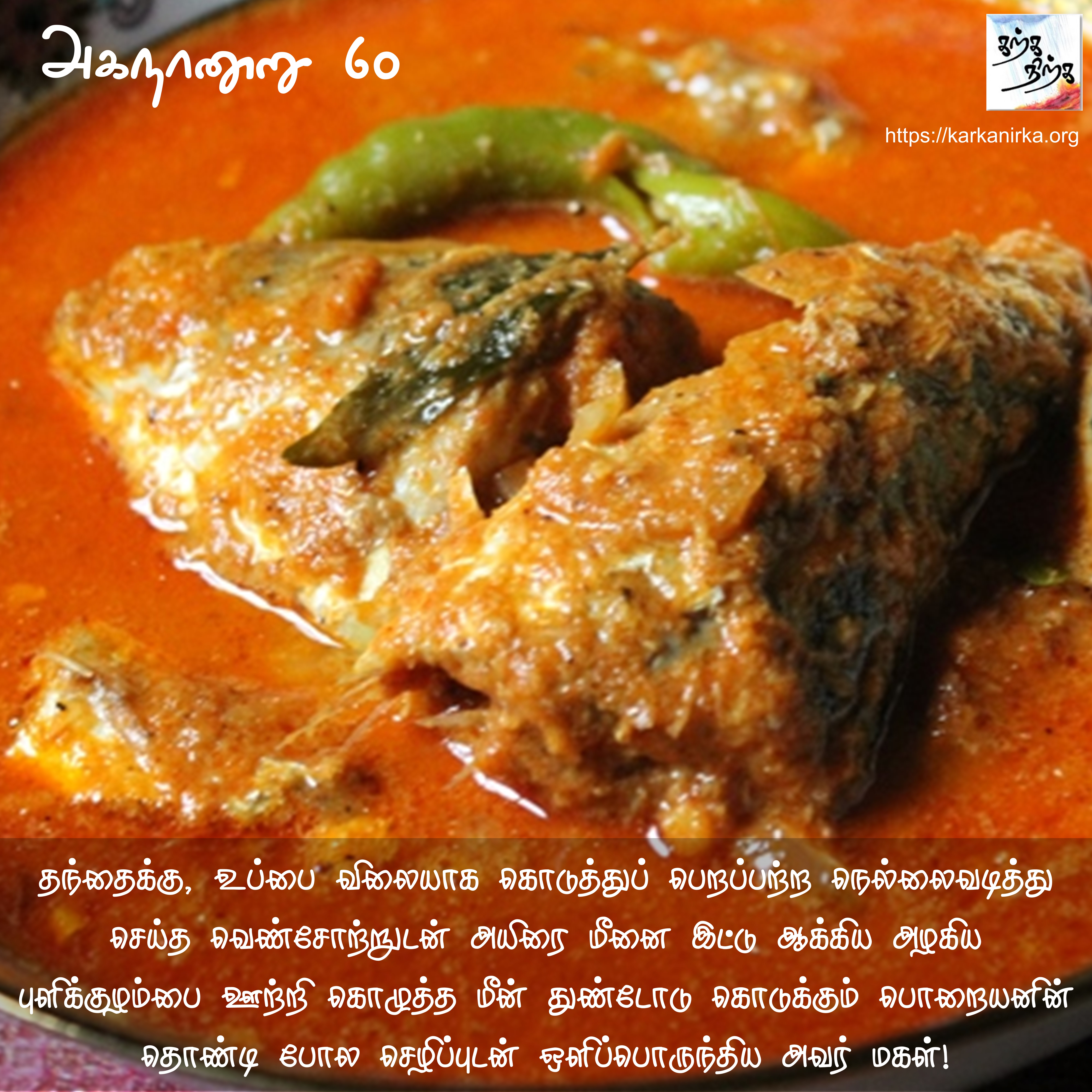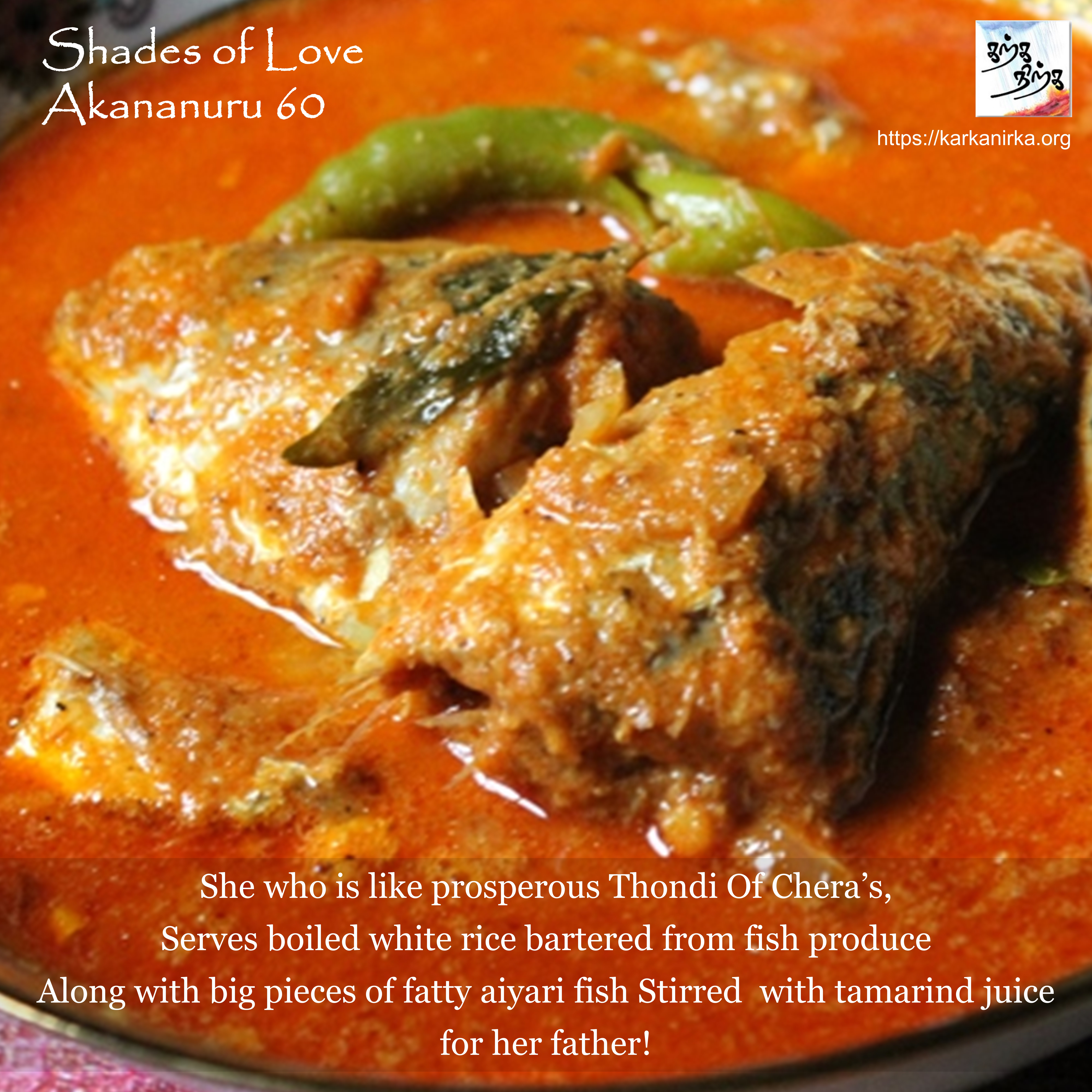 Situation: Thalaivan (hero) and Thalaivi (heroine) are meeting each other secretly with help of Panki (friend of Thalaivi). Thalaivan is too romantically involved and Panki warns him that if their mother gets to know about Thalaivi’s affair she will lock her in the house like how Cholas lock their tribute in Kudavayil (Kumbakonam). Interestingly for people who have seen Ponniyin Selvan movie, they would have seen a scene where Vandhiyathevan (Karthi) actually stumbles by Chola’s treasury locked in a cage. The poem interesting notes that barter price of pound of salt is pound of white rice. Also Aayirai – Mackerel kolambu was popular dish 2000 years back (still is!).