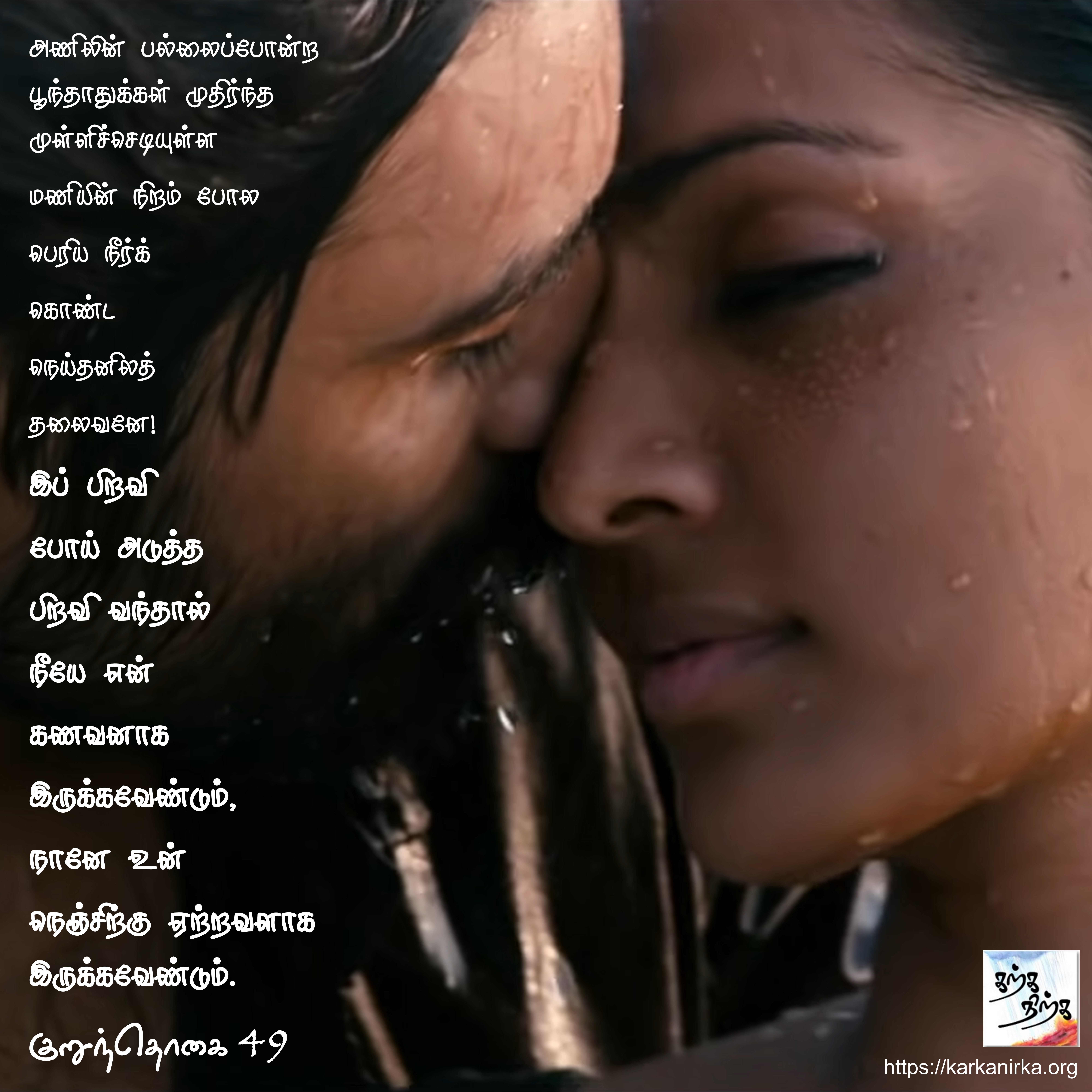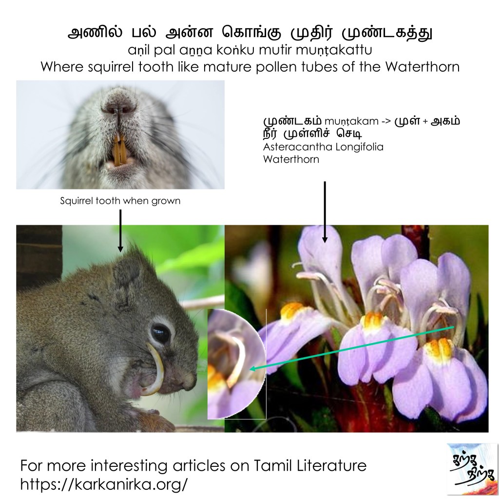 Situation: Thalaivi (Heroine) confesses to hero that not only in this life but in lives to come after she wants him to be her husband and she wants to be his sweet heart. But what stands out in this poem is the simile comparing squirrel teeth to water thorn flower pollen tube.