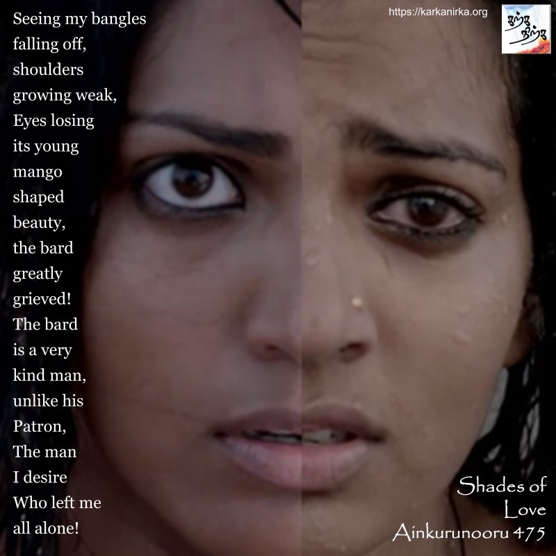 Situation: Thalaivan (Hero) is away and has sent a messenger, a singing minstrel/bard to appease his lover (Thalaivi). Seeing the status of Thalaivi being away from Thalaivan, the bard feels pity. Thalaivi feels Thalaivan doesn’t even have the pity/emotions displayed by Bard. She mocks the Thalaivan through this poem. This poem also packs a beautiful imagery to describe women’s eye.