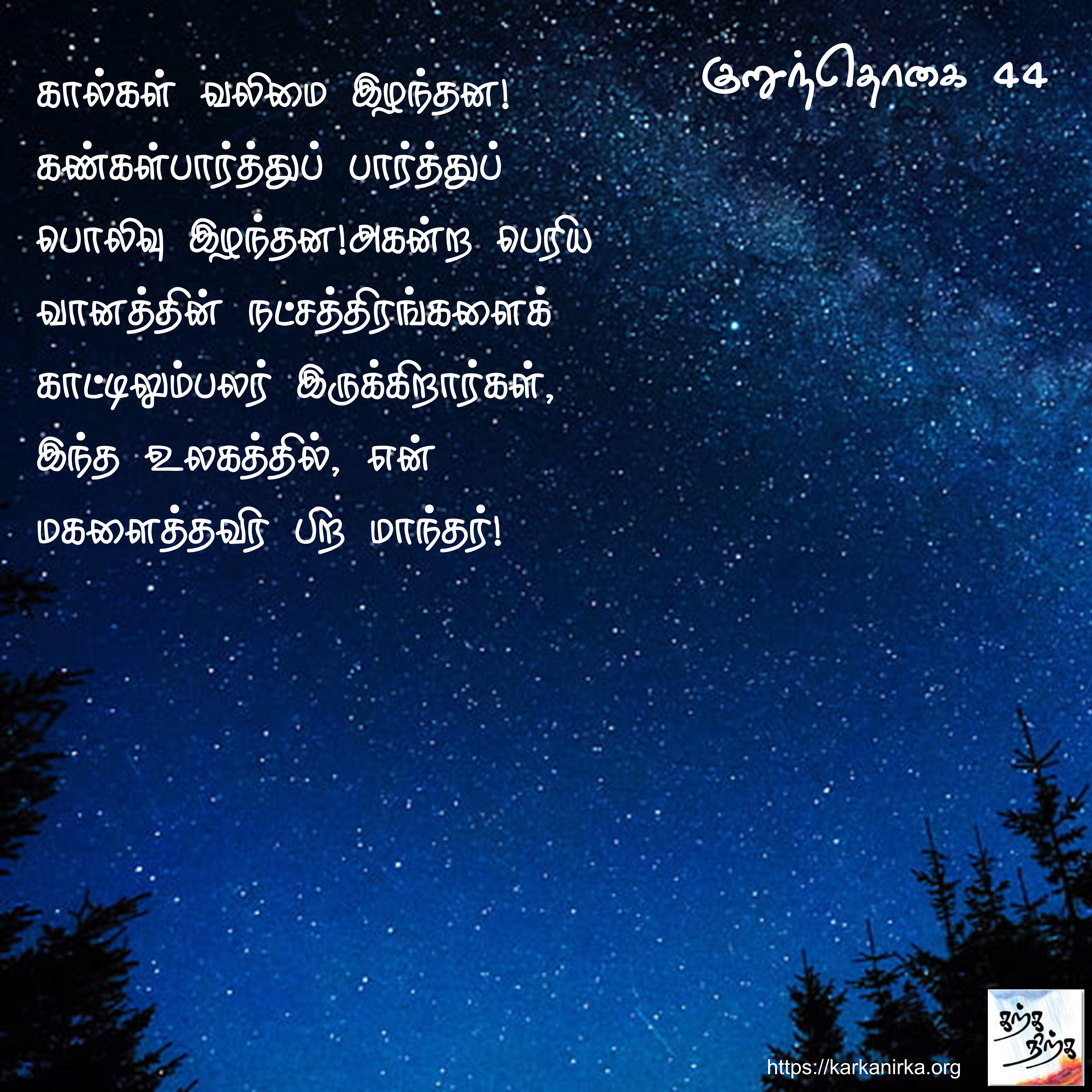 Situation: Thalaivan (Hero) is in love with Thalaivi (Heroine). Their love is exposed and Thalaivi’s parents lock her up. Thalaivi with help of her friend (Panki) elopes with Thalaivan. Thalaivi’s relatives regret their action and go in search of Thalaivi. This poem is uttered by the foster mother/mother of the girl who has become tired searching for the girl.