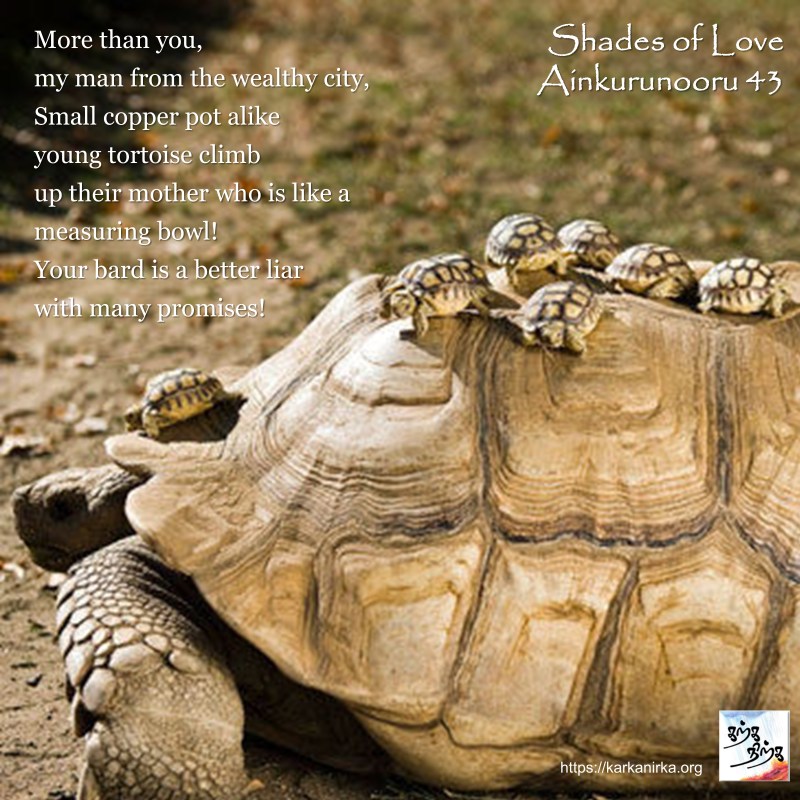 Mother tortoise carrying the hatchlings -> Thalaivi taking full responsibility for children while Thalaivan is irresponsible and roaming around