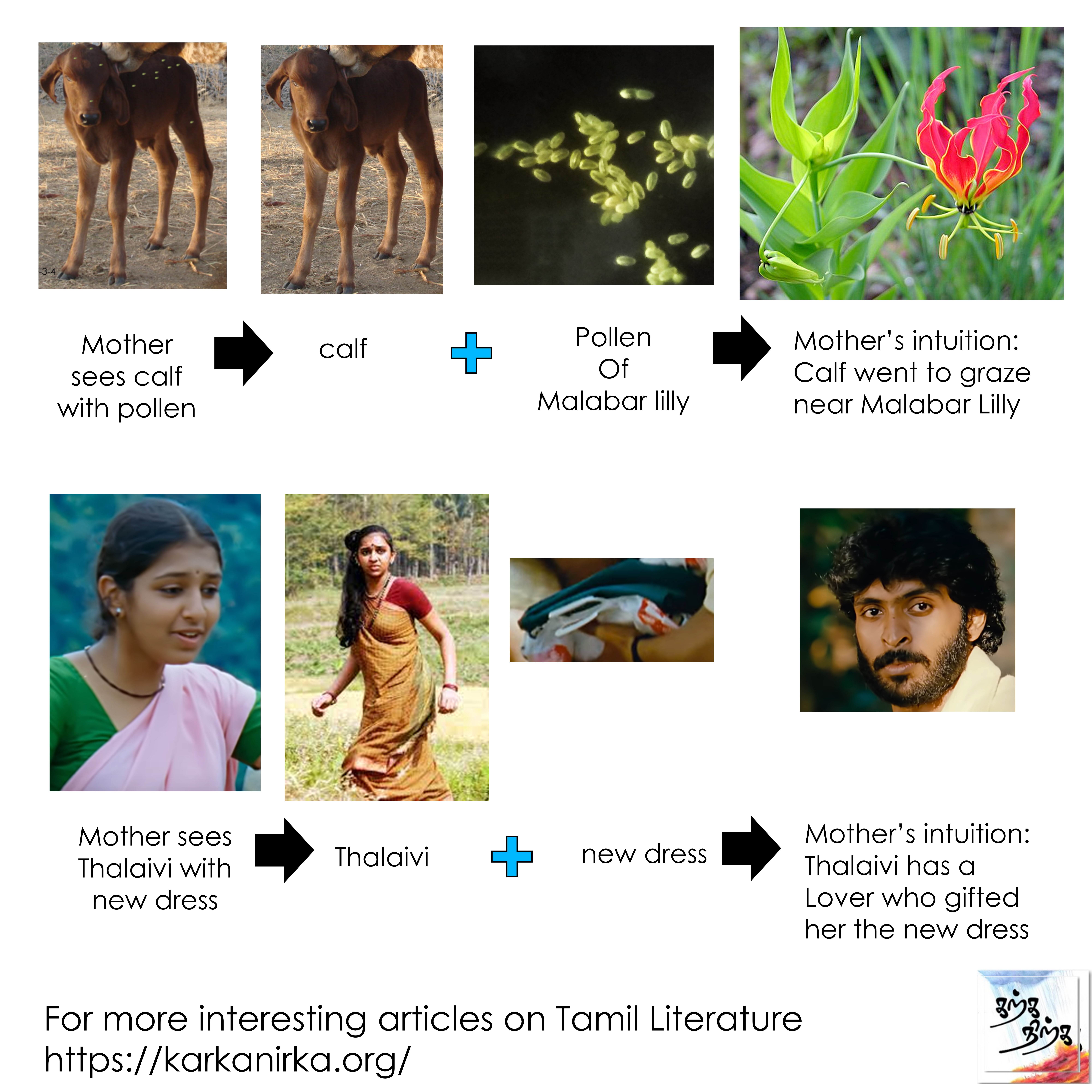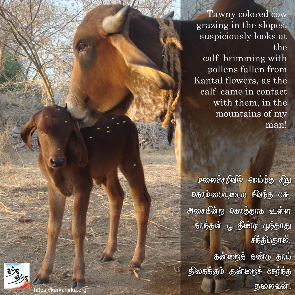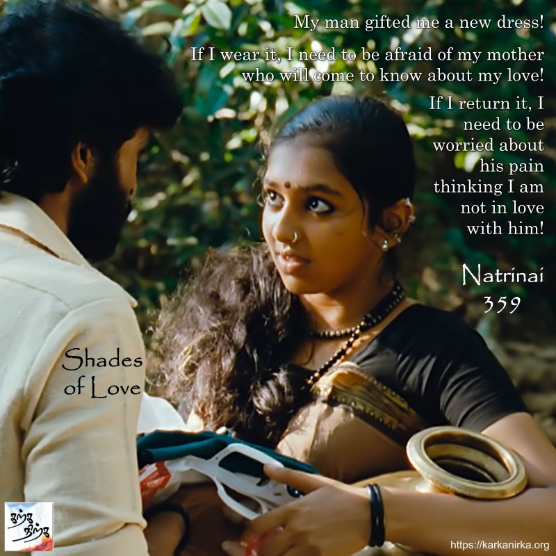 Situation: Thalaivan (Hero) is in love with Thalaivi (heroine). He gives her a new dress made up leaves (apparent fashion in the tribal cultures). Thalaivi doesn’t know whether to take it or not. She is afraid her mother will find out about her love if she wears a new dress. She is also afraid if she returns it, her lover will feel depressed. Poet beautifully describes the effort taken by the lover and also has beautiful imagery for describing mother’s intuition.
