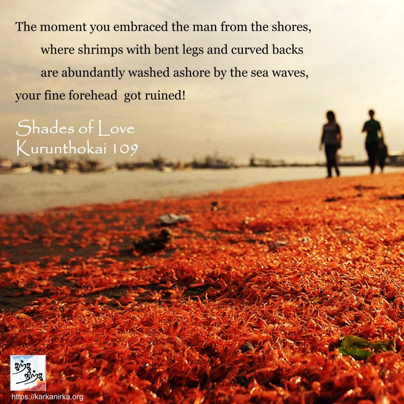 Sea is supposed to be home of the Shrimps, but it has washes the shrimp away to shore to their death -> Thalaivan is supposed to be sanctuary for Thalaivi, but he has deserted Thalaivi and leading her to her death!