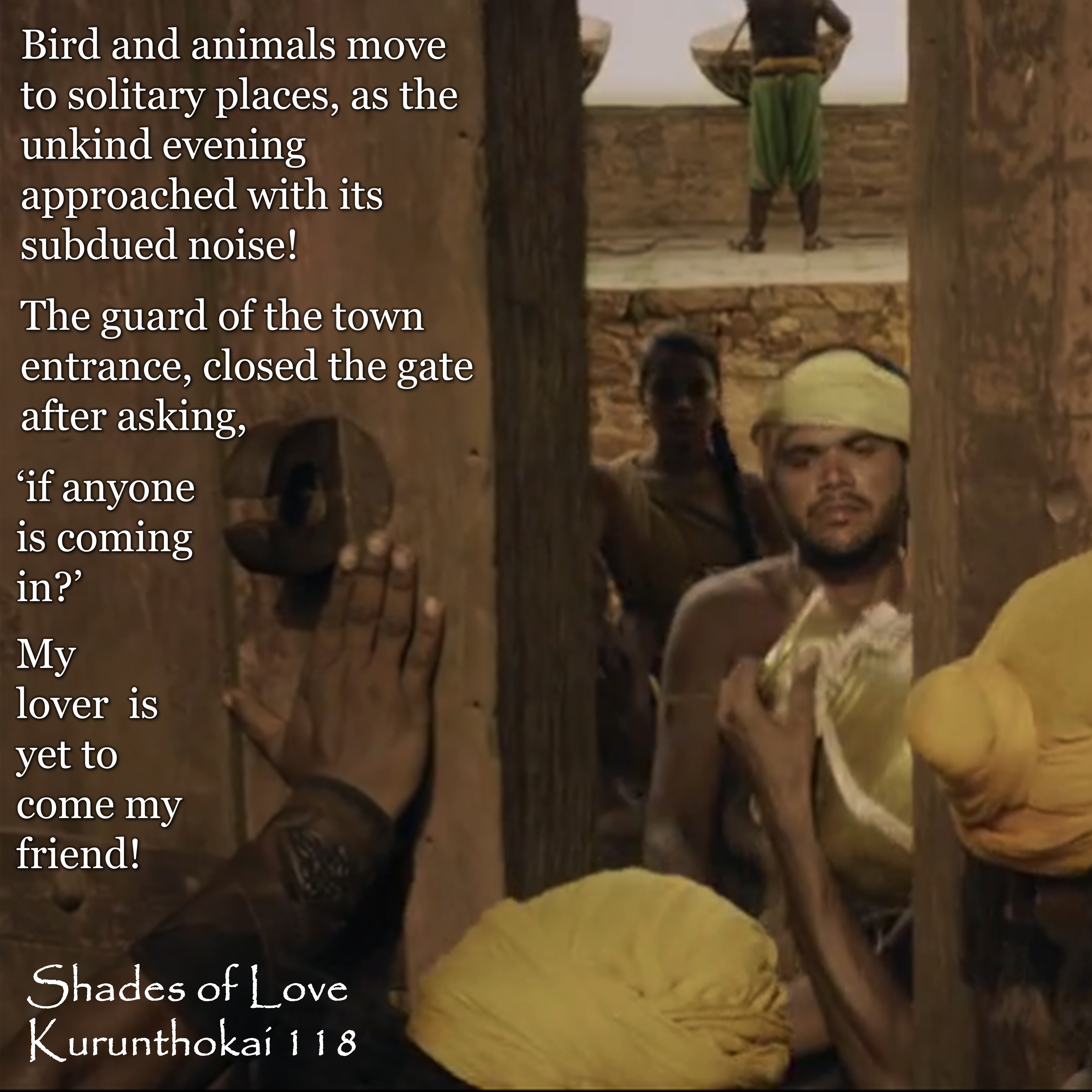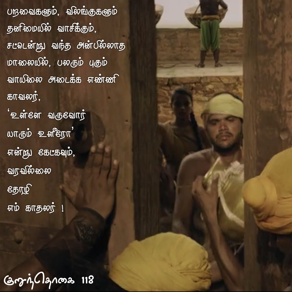 Situation: Thalaivan (Hero) who is in love with Thalaivai (Heroine), has not entered the fortified town by Dusk. This means he will not meet her secretly in the night. Thalaivi utters this poem to her friend to express her frustration.