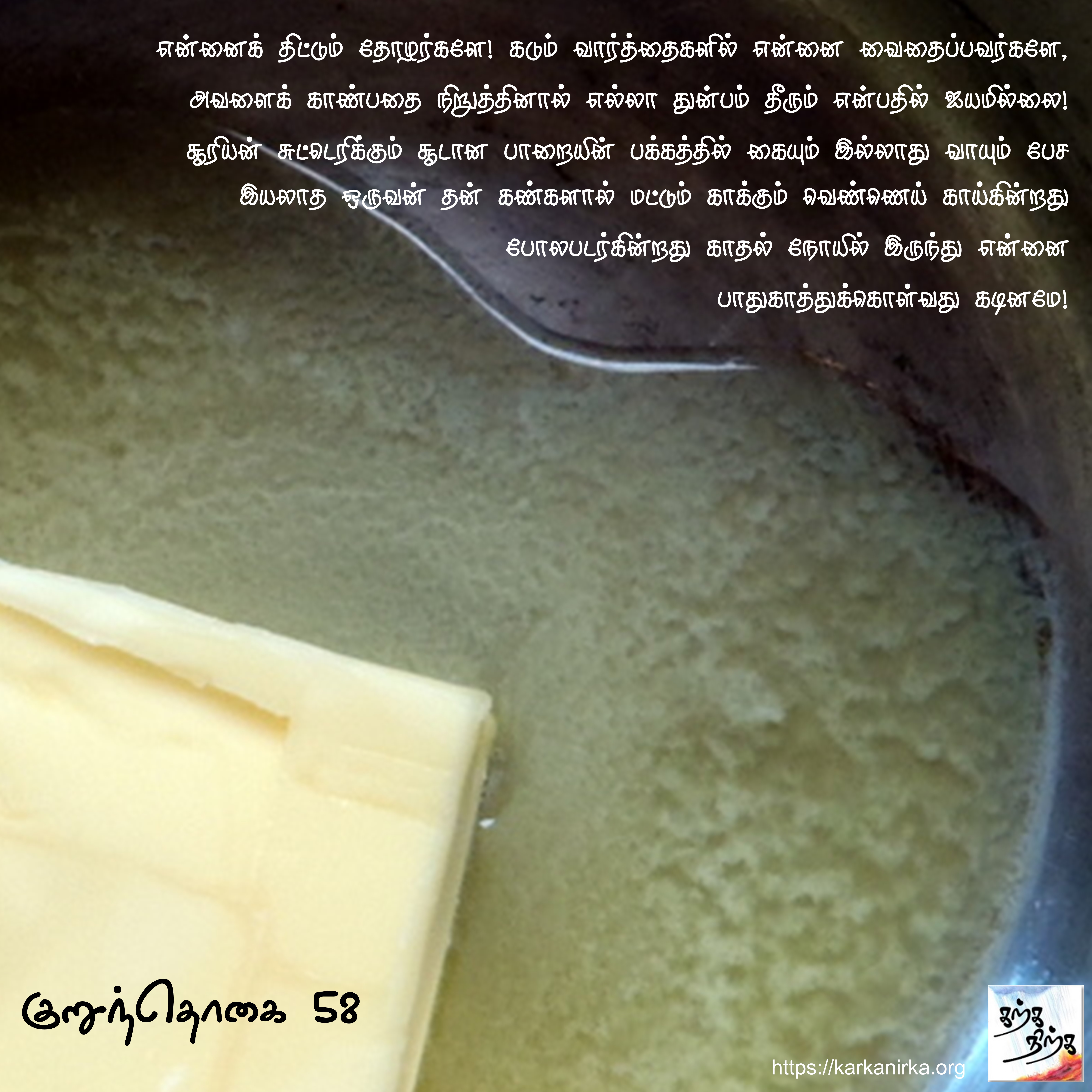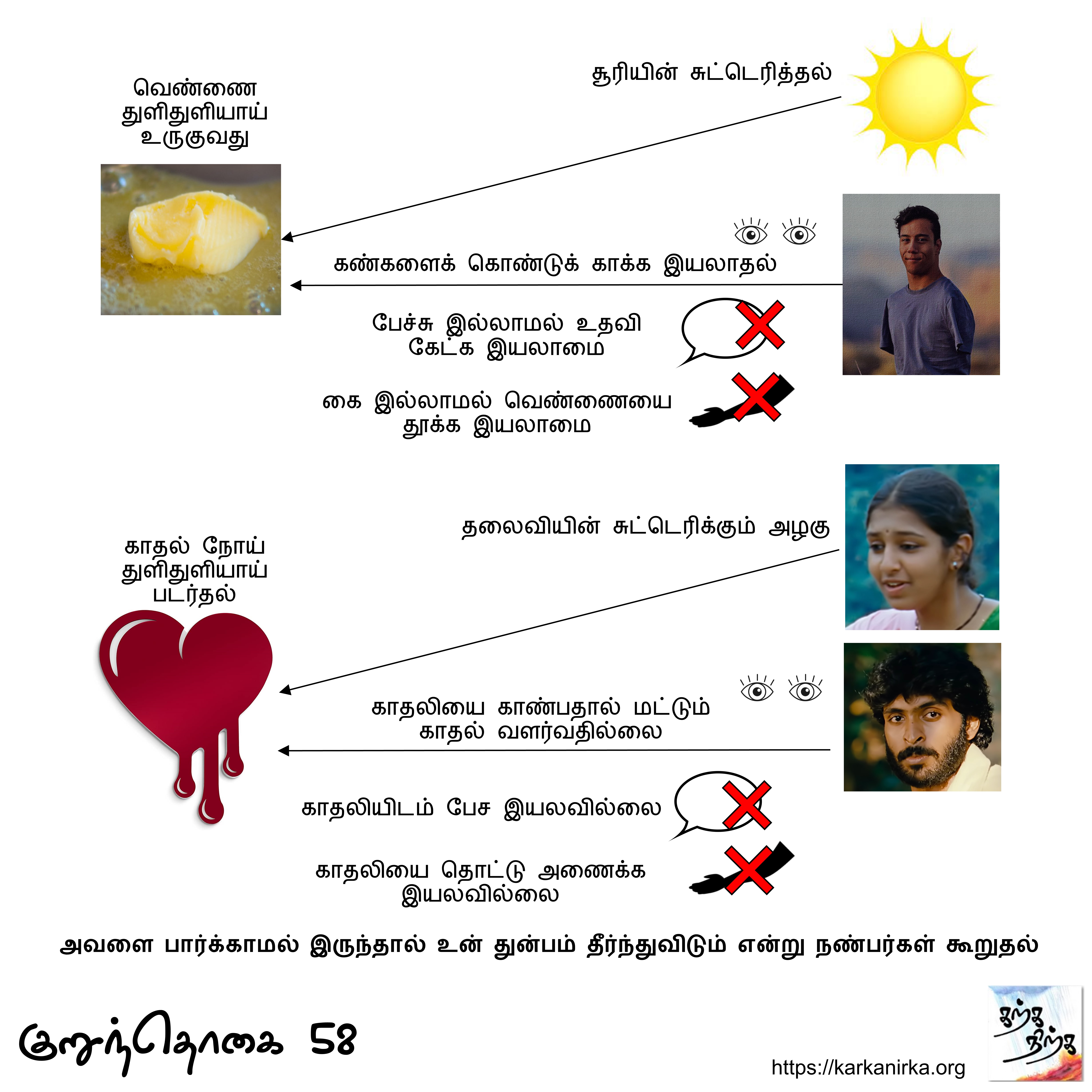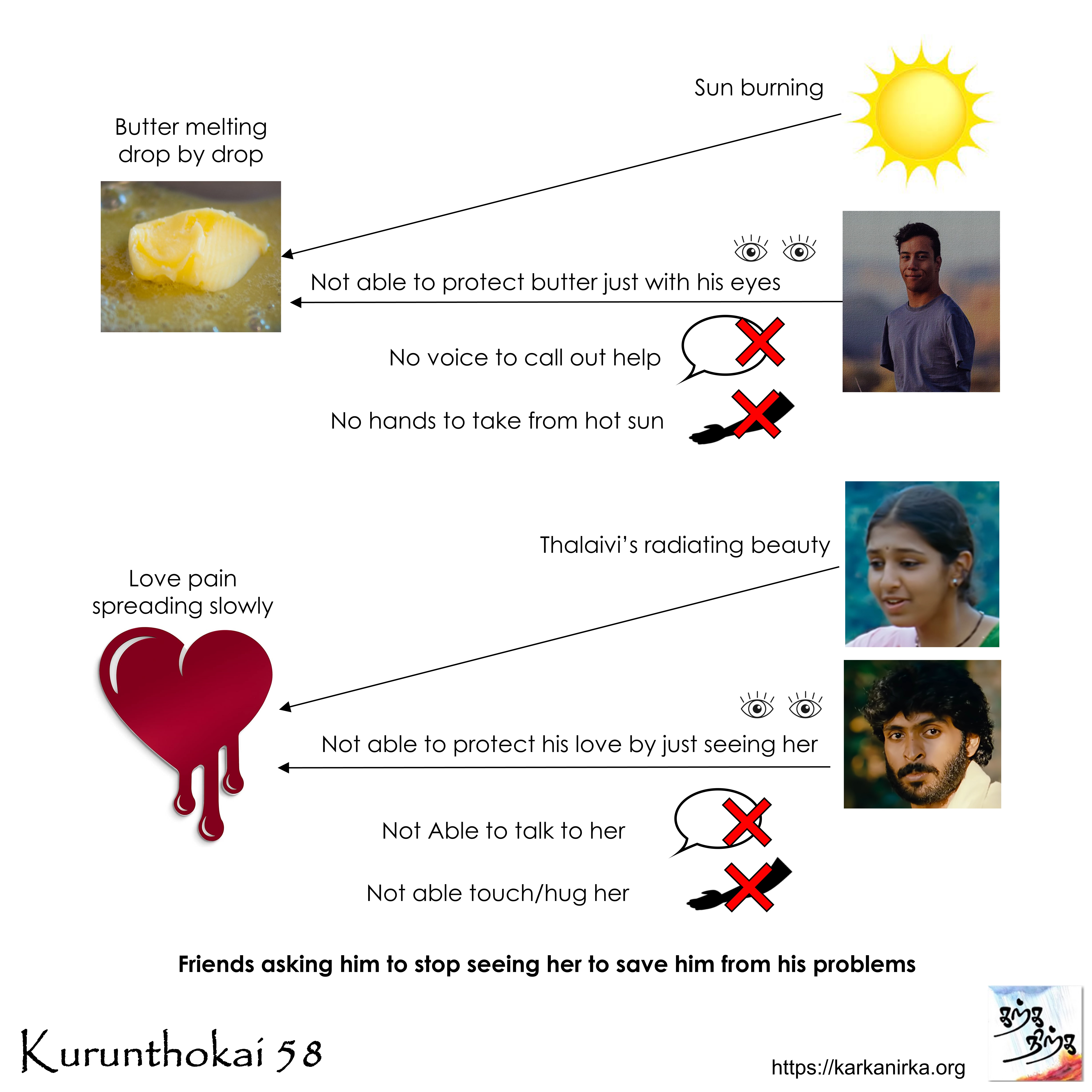 Situation: Thalaivan (Hero) has one sided love with Thalaivi (Heroine). He is tormented by Thalaivi’s beauty, but is not able to talk to her or take his love forward. His friends (Thozhar/Kelir) warn him that he is turning mad and ask him to stop seeing or thinking about Thalaivi. Poetics of this poem is generally considered one of the best in Sangam literature.