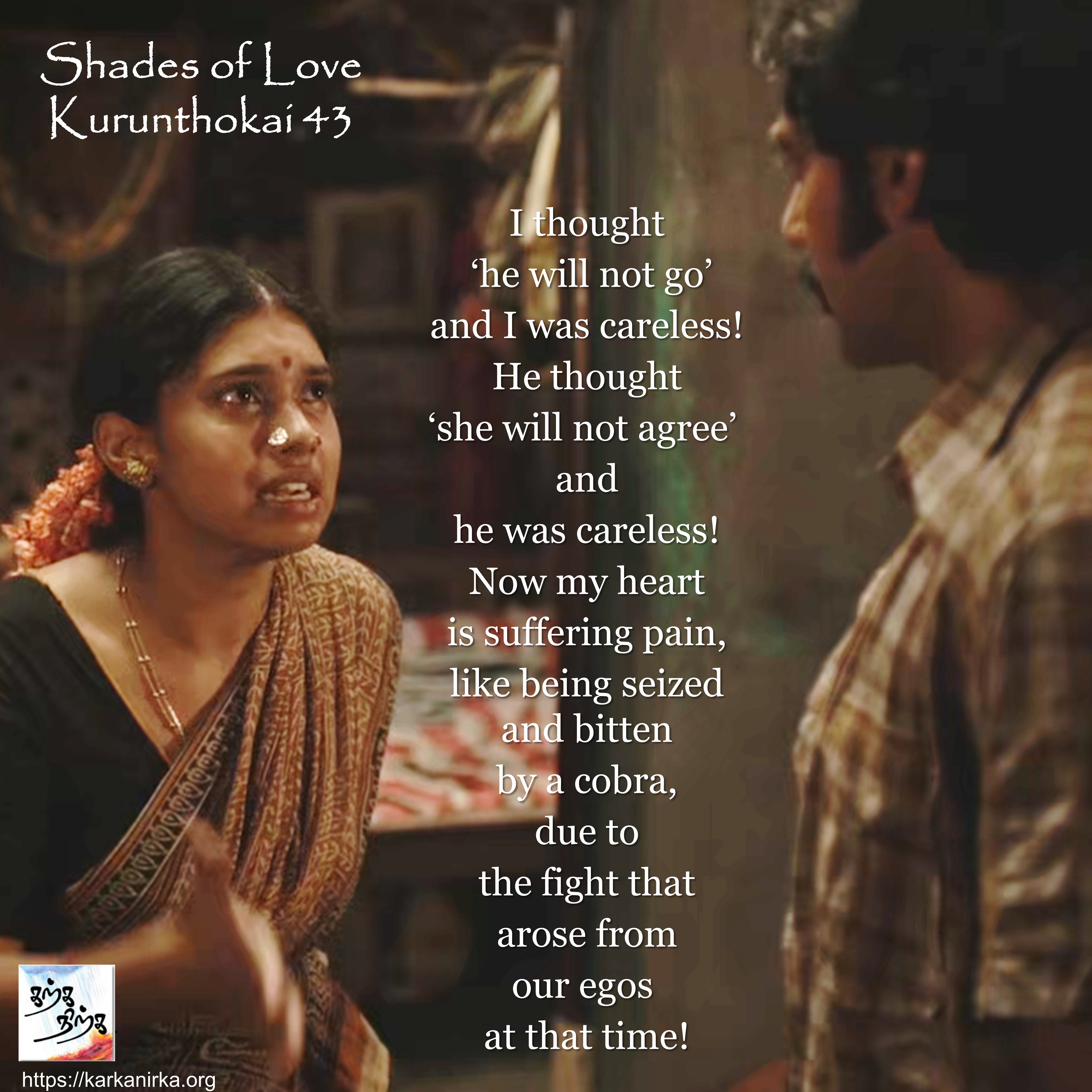 The poem discusses about Ego between couples. The word for Ego here is āṇmai, which is interesting as today’s usage is Manliness or being valient. But in Tamil etymology – Manliness, Bravery and Ego has same root. So here the Thalaivi says both of them due to their āṇmai, didnt yield. So possibly not yielding is base meaning of Manliness, Bravery and Ego.