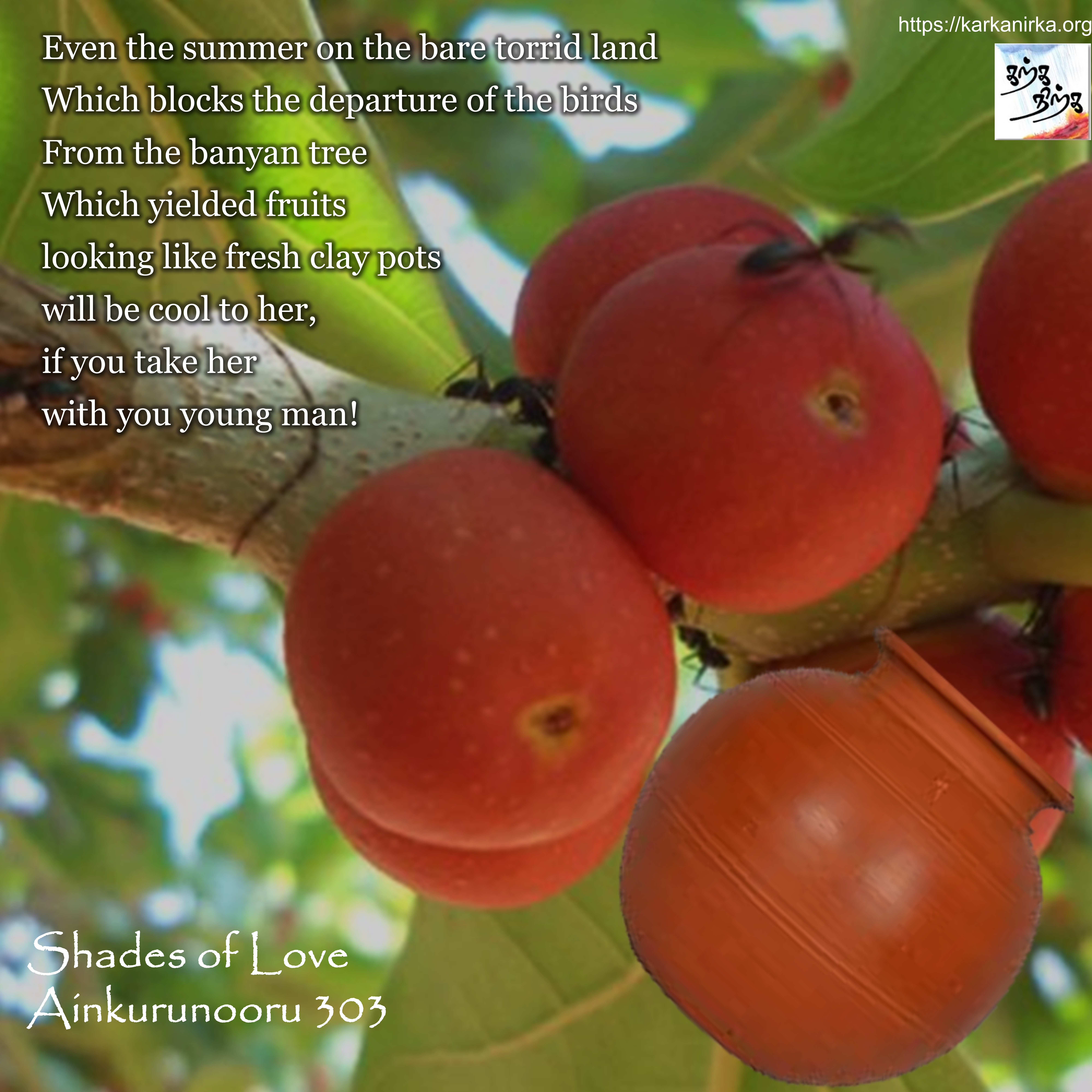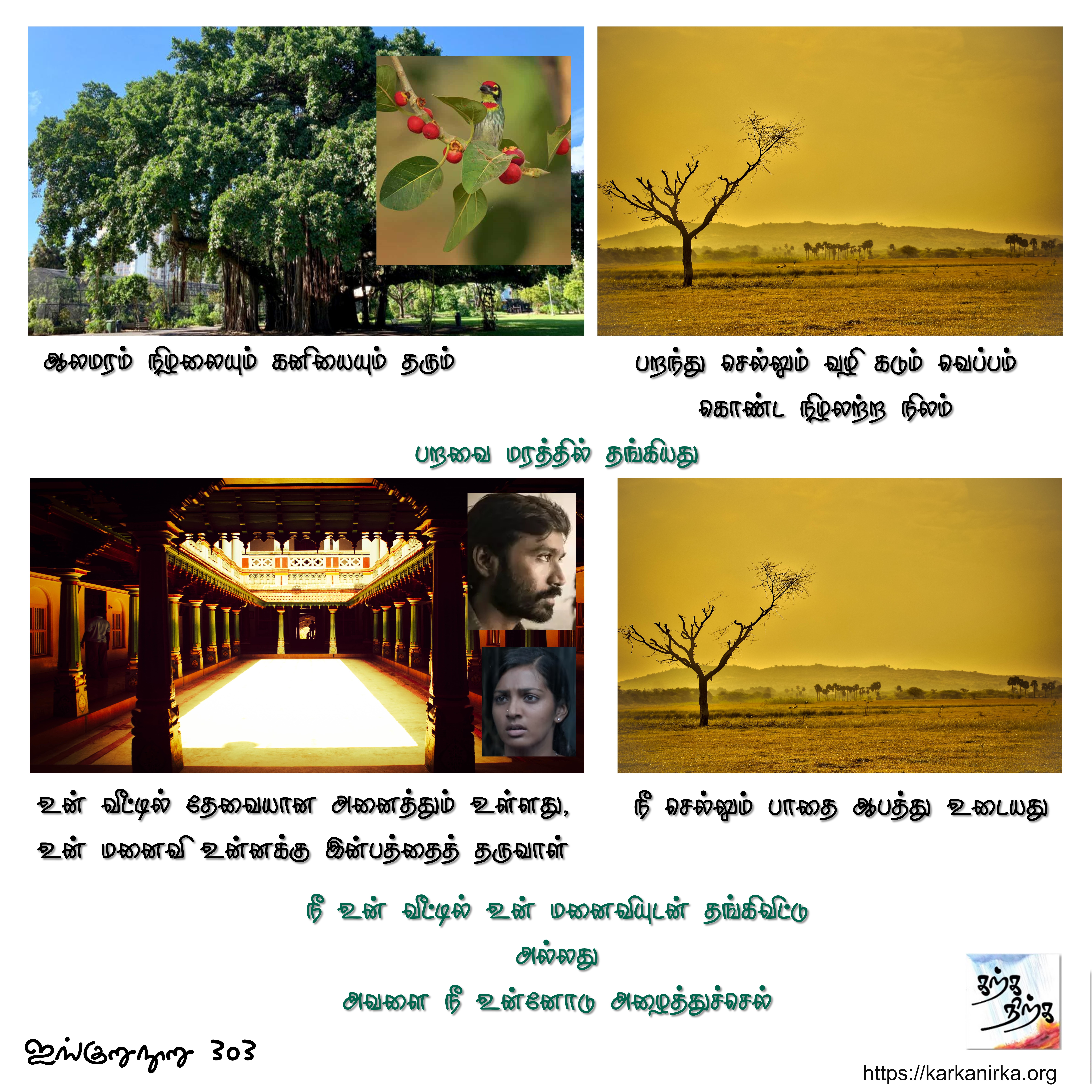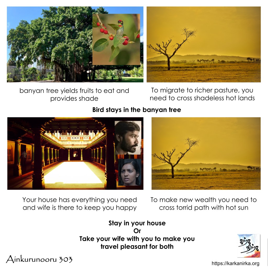 Situation: Thalaivan (Hero) is married to Thalaivi (heroine). He plans to leave her in search of wealth (probably to participate in Indo Roman trade). Thozhi (Thalaivi’s friend) advises Thalaivan either to stay put or take his wife along with him.