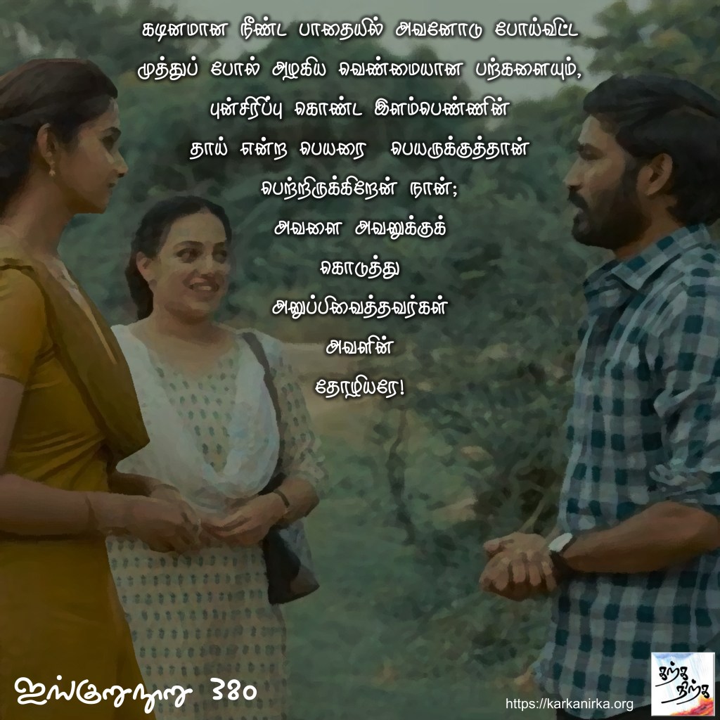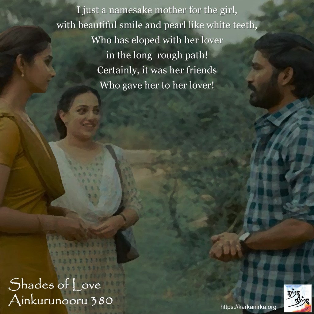 Thalaivi (Heroine) was in love with Thalaivan (Hero) and eloped with him due to objection from her family for their wedding. Here her foster mother utters the poem saying that she is only a mother by name and it was her friends who did her duties, mocking her friends.