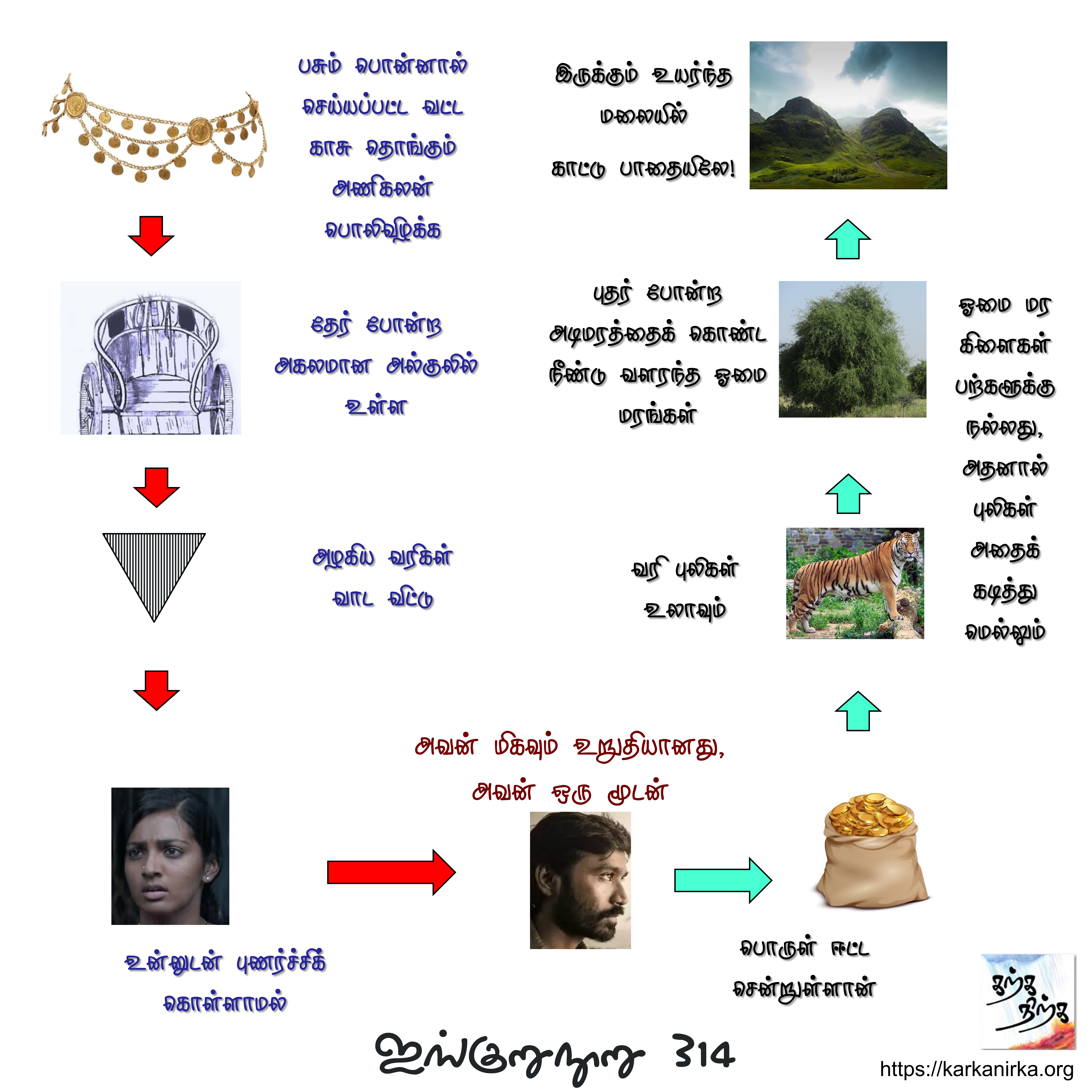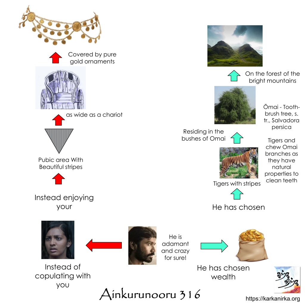 Situation: Thalaivan (hero) who is married to Thalaivi (heroine), has left her to earn wealth. Thozhi (Thalaivi’s friend) curses Thalaivan for making such rash decision.