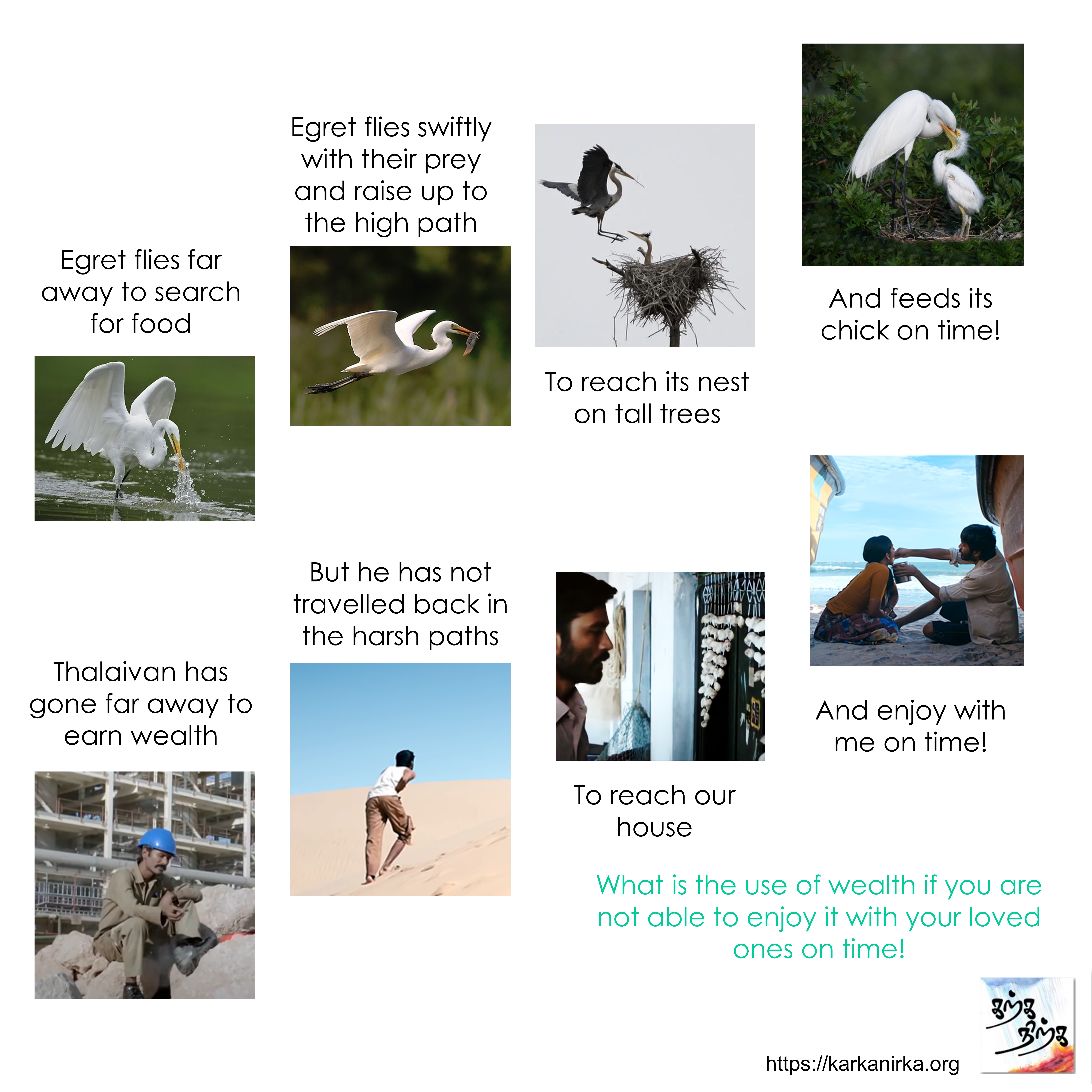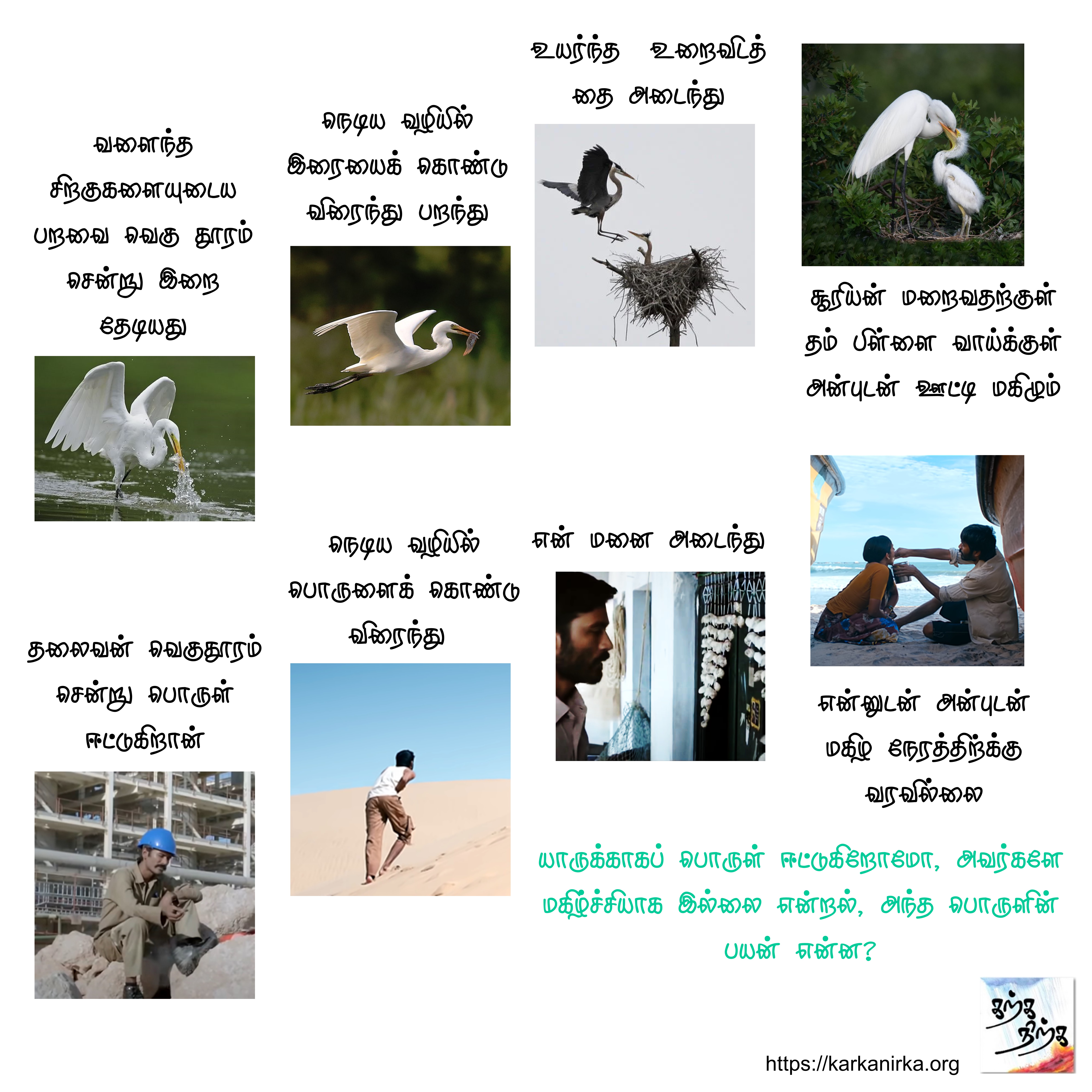 Situation: Thalaivan (hero) is wedded to Thalaivi (heroine). Against the wishes of Thalaivi, he decides to embark on journey to earn wealth and has not returned in time. Thalaivi utters this poem. #MEMEthokai #karkanirka