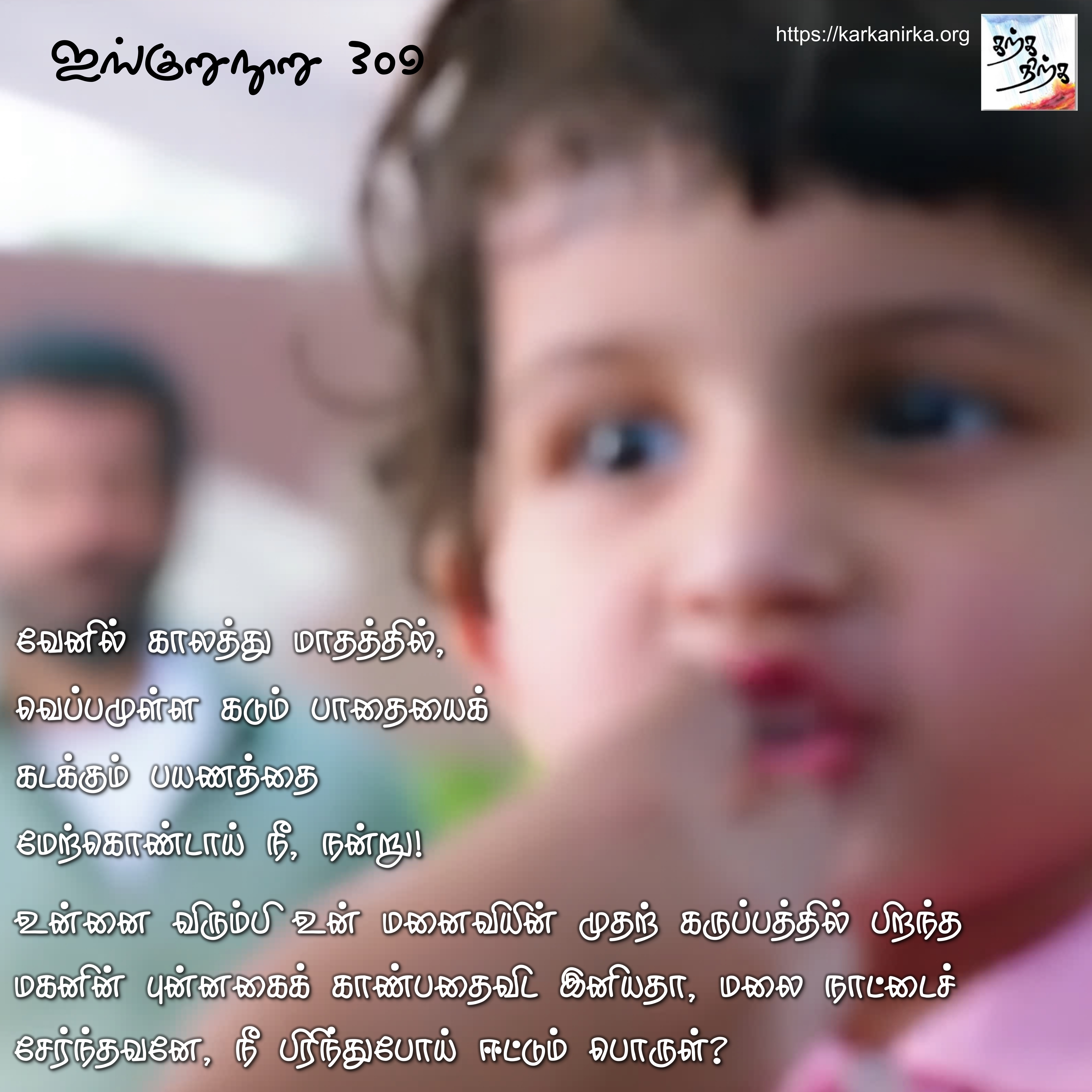 Situation: Thalaivan (hero) is wedded to Thalaivi (heroine). Against the wishes of Thalaivi, he decides to embark on journey to earn wealth and has not returned in time. Thalaivi utters this poem. #MEMEthokai #karkanirka
