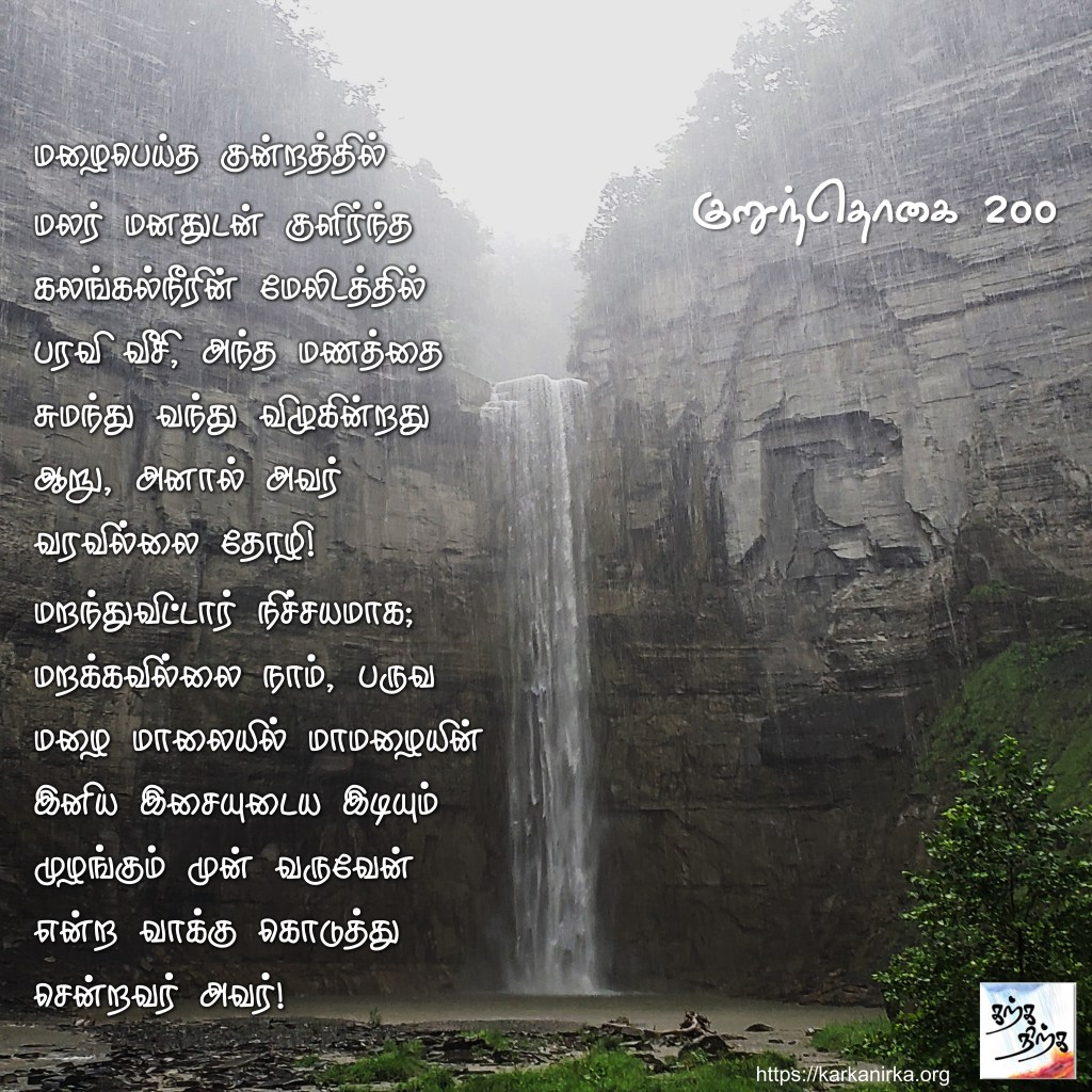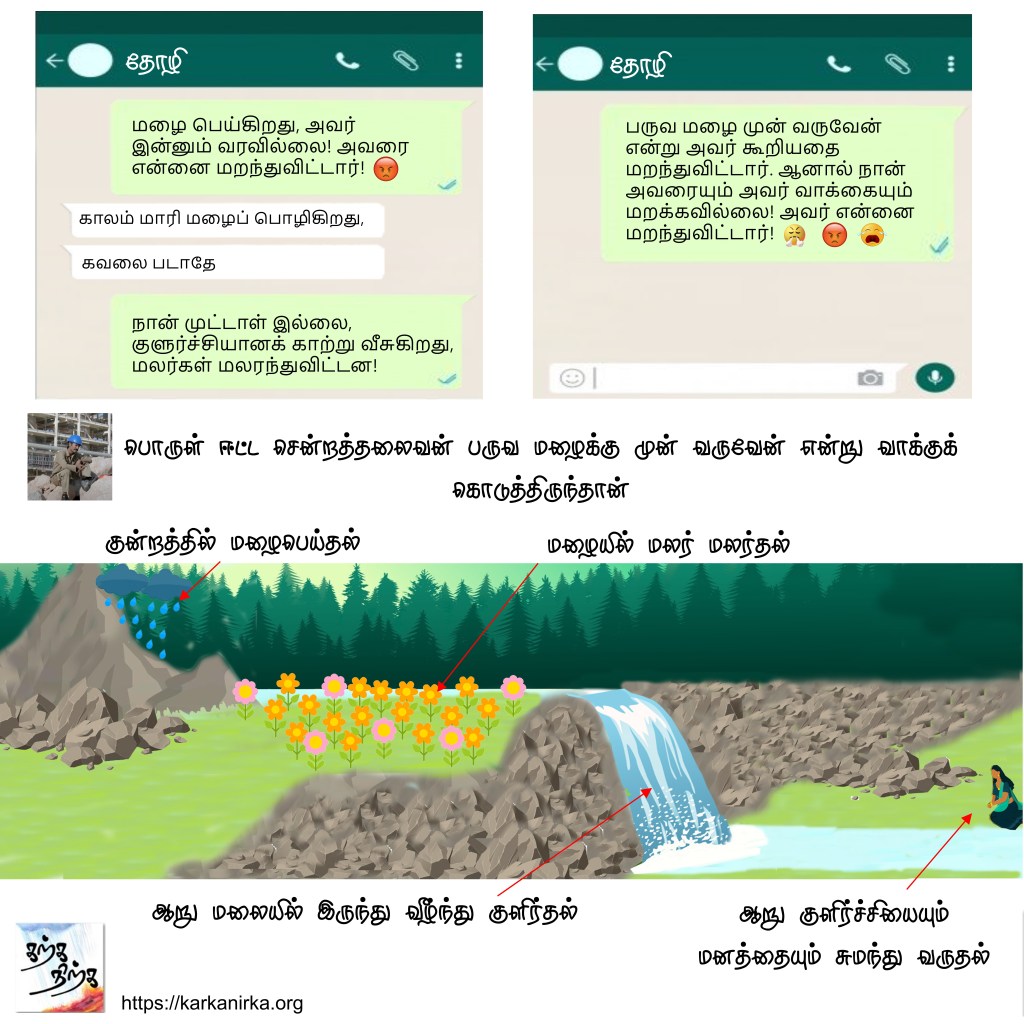 Situation: Thalaivan (hero) is wedded to Thalaivi (heroine). He leaves to earn wealth, with a promise of returning back before monsoon season. it rains, Thozhi (friend) tries to convince Thalaivi that this was unseasonal rain. Thalaivi utters this poem. #MEMEthokai #karkanirka