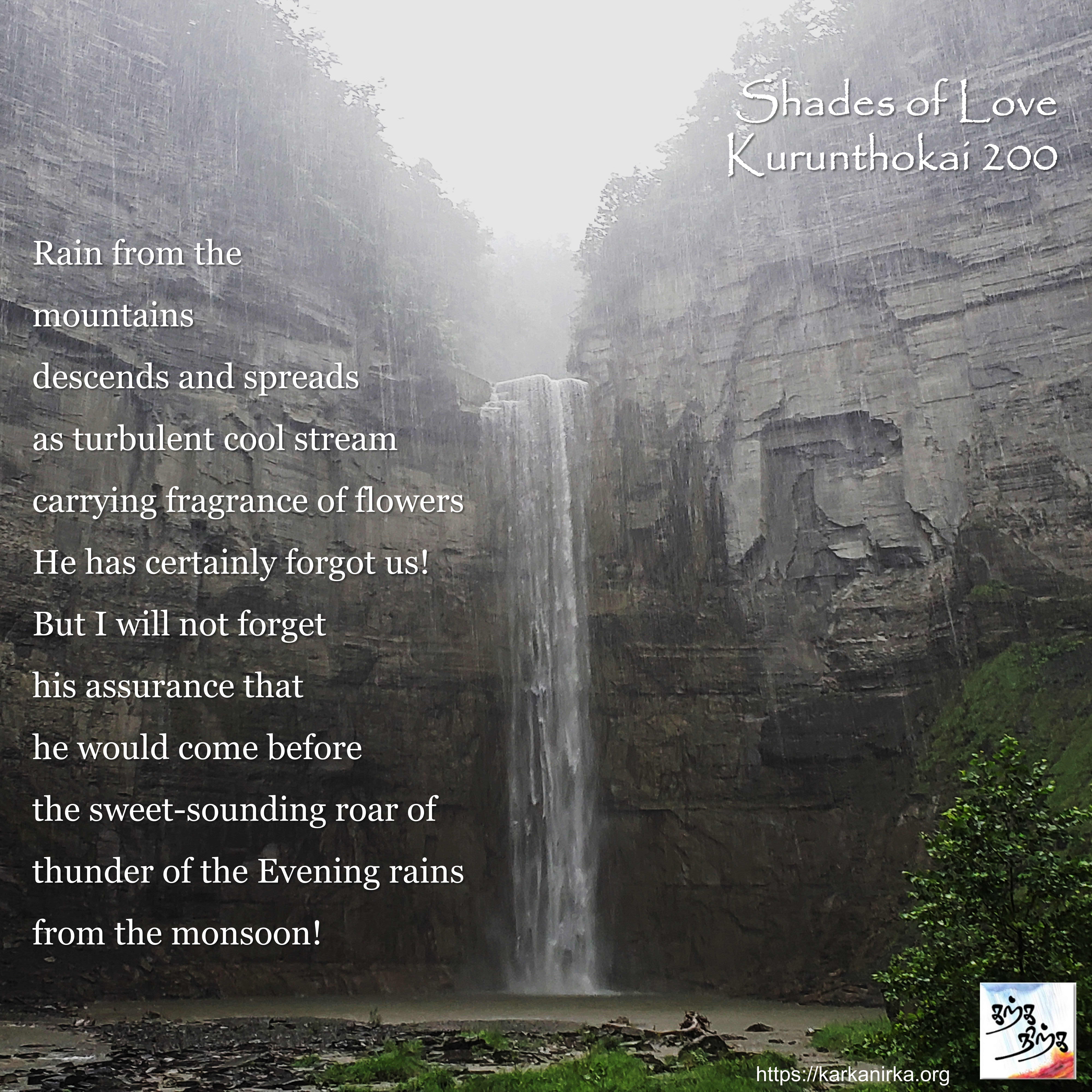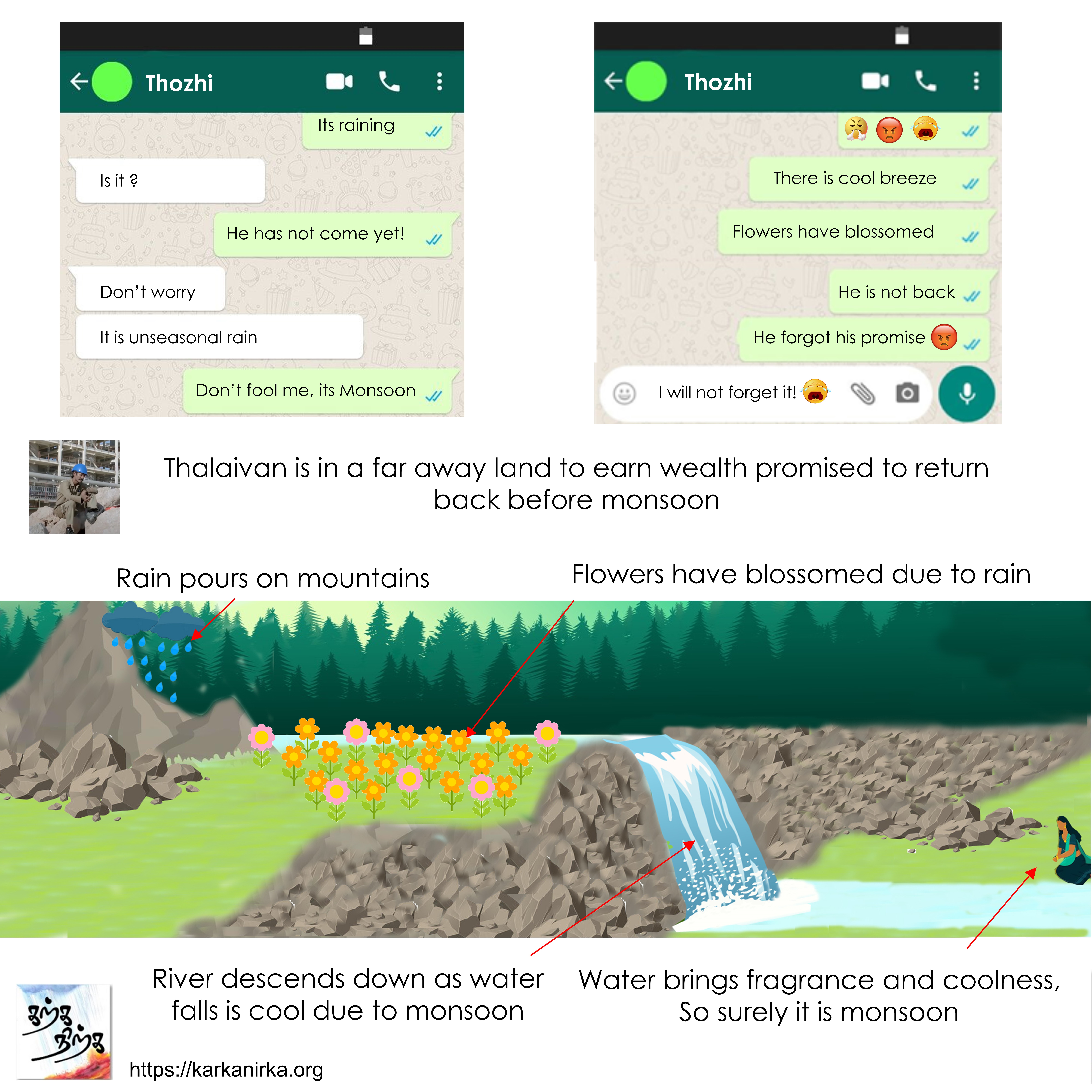 Situation: Thalaivan (hero) is wedded to Thalaivi (heroine). He leaves to earn wealth, with a promise of returning back before monsoon season. it rains, Thozhi (friend) tries to convince Thalaivi that this was unseasonal rain. Thalaivi utters this poem. #MEMEthokai #karkanirka