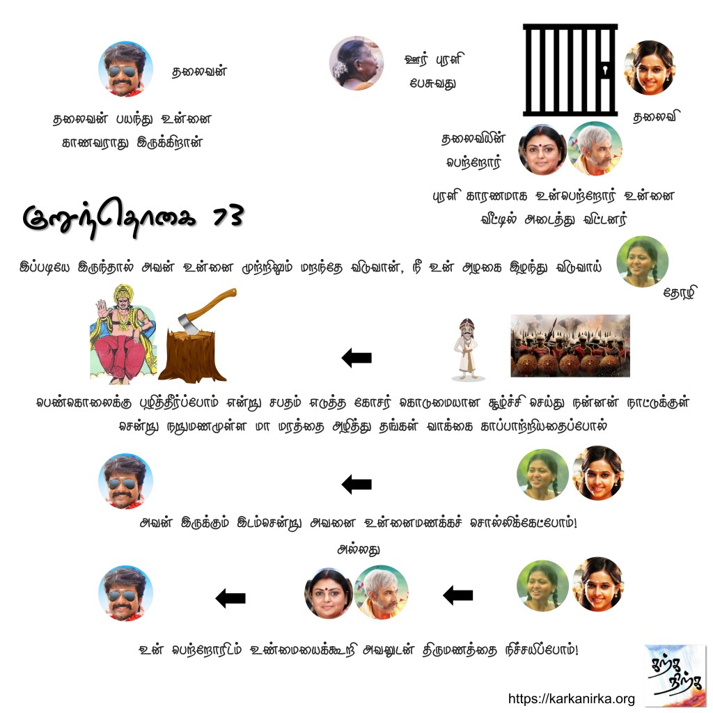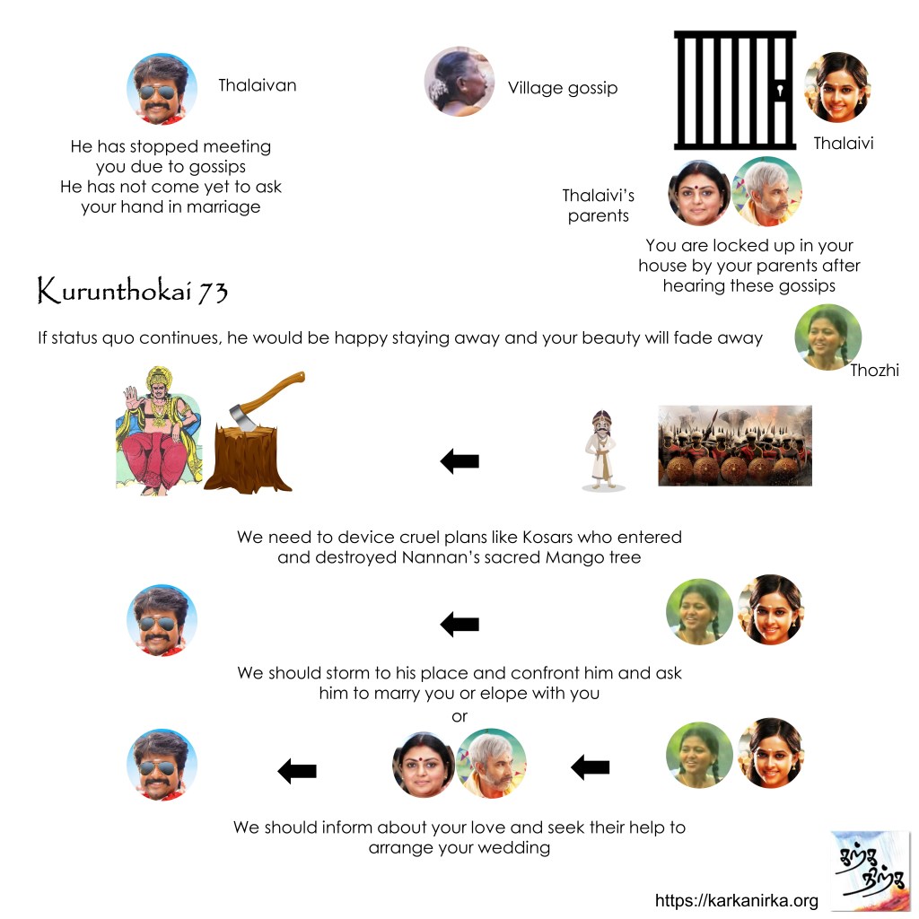 Situation: Thalaivan (Hero) is in love with Thalaivi (heroine), but is staying away from her, afraid of village gossips. Thozhi (Thalaivi’s friend) utters this poem advising they should do something to shake up the situation. #MEMEthokai #karkanirka