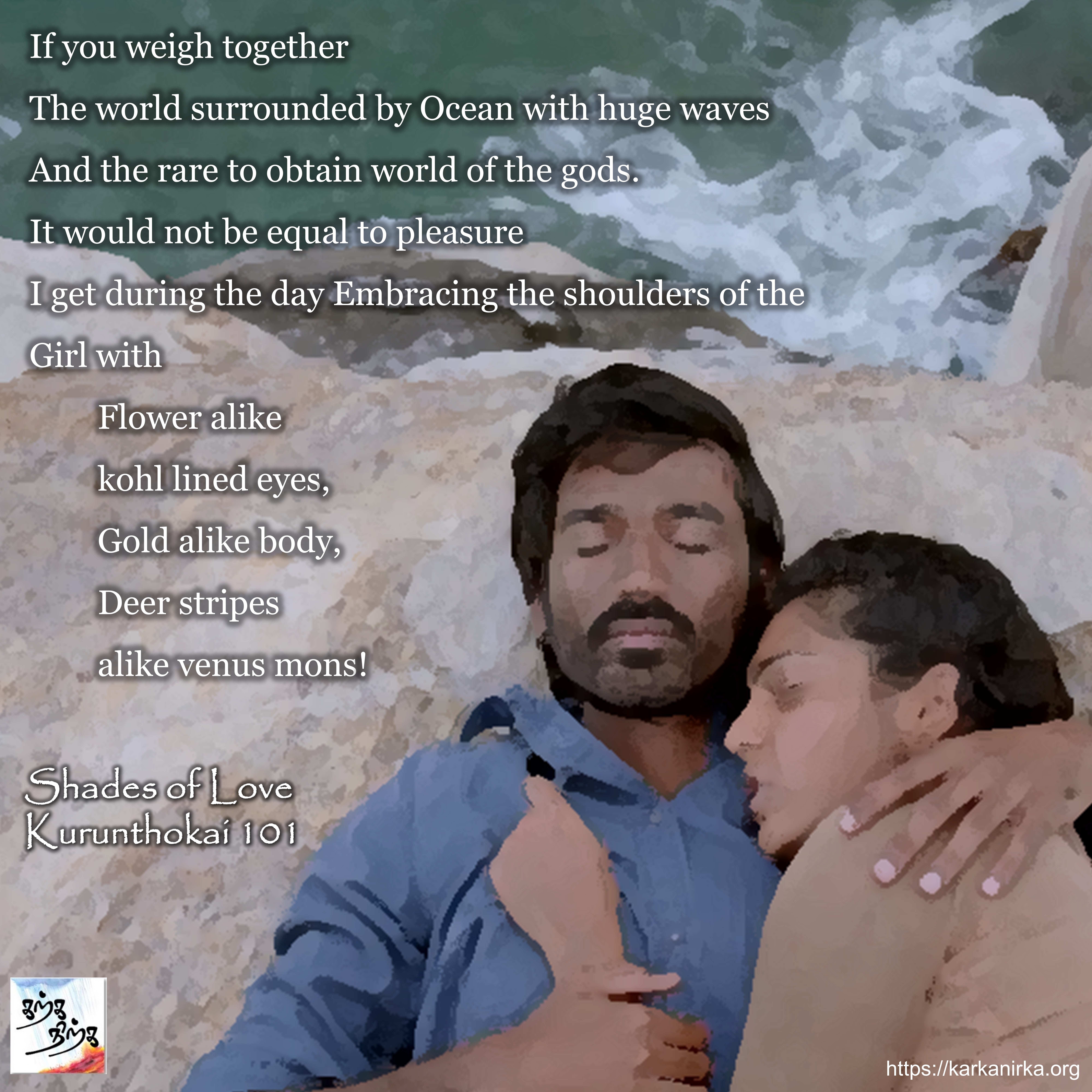 Alkul – straight meaning is pubic mons, vaginal area. This is the primary meaning used in Sangam literature. Women’s beauty is described by her breast and vaginal areas in these poems. Avoiding recency bias (of victorian era costumes), being topless or naked were common due to weather in Ancient India and Tribal cultures. Translators and commentators usually avoid this meaning to make poems palatable for all readers. They usually use waist or side as a substitute.