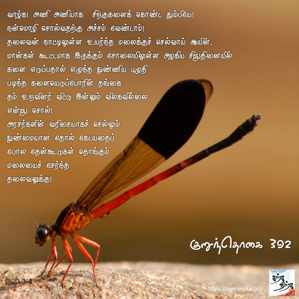 Kurunthokai 392, Thumpisēr Keeranār, Kurinji Thinai – What the heroine’s friend said to the dragonfly, as the hero listened nearby