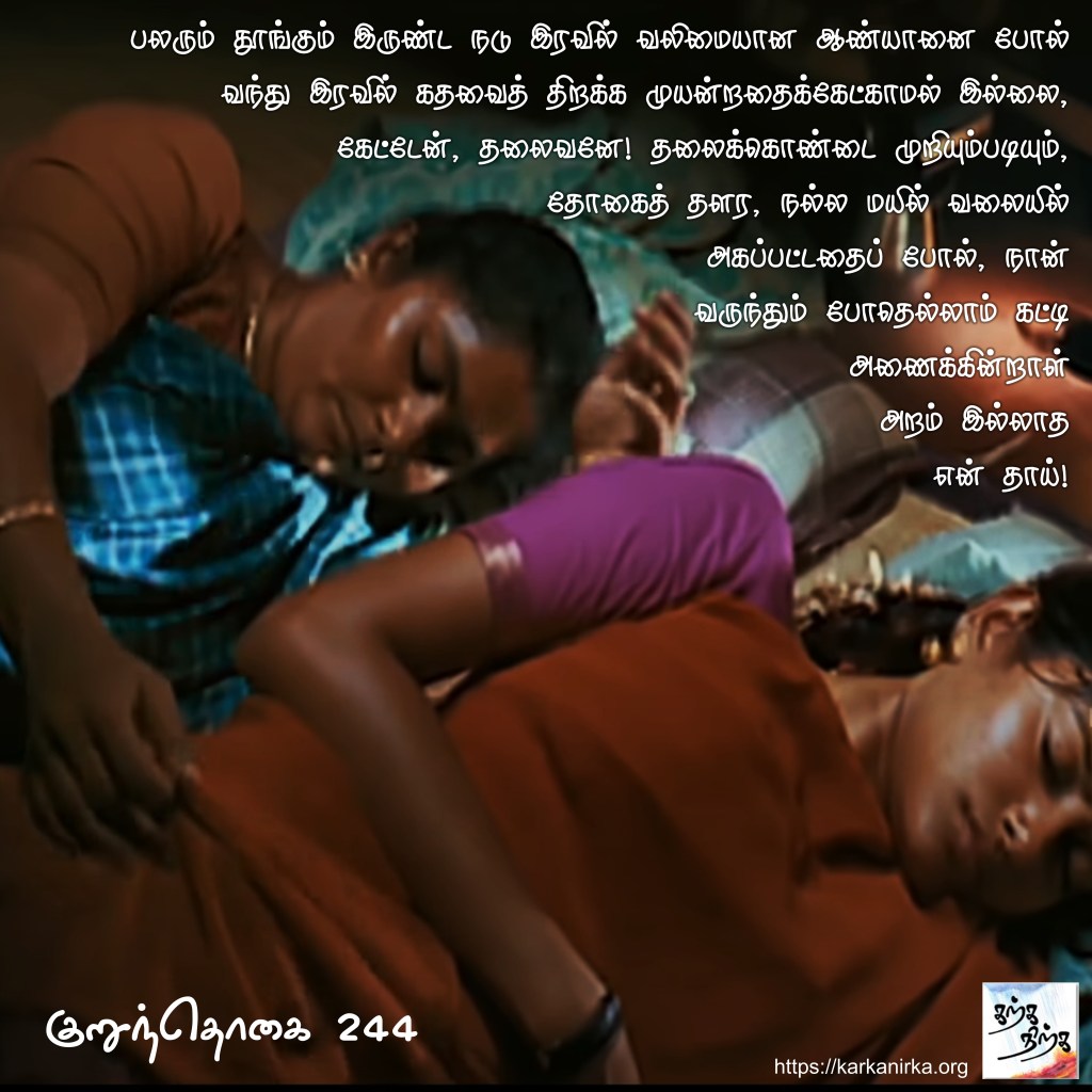 Situation: Thalaivan (hero) is in love with Thalaivi (heroine). He meets her secretly every night. Thozhi (Thalaivi’s friend) utters this poem to explain Thalaivan why Thalaivi couldn’t meet him previous night. #MEMEthokai #karkanirka