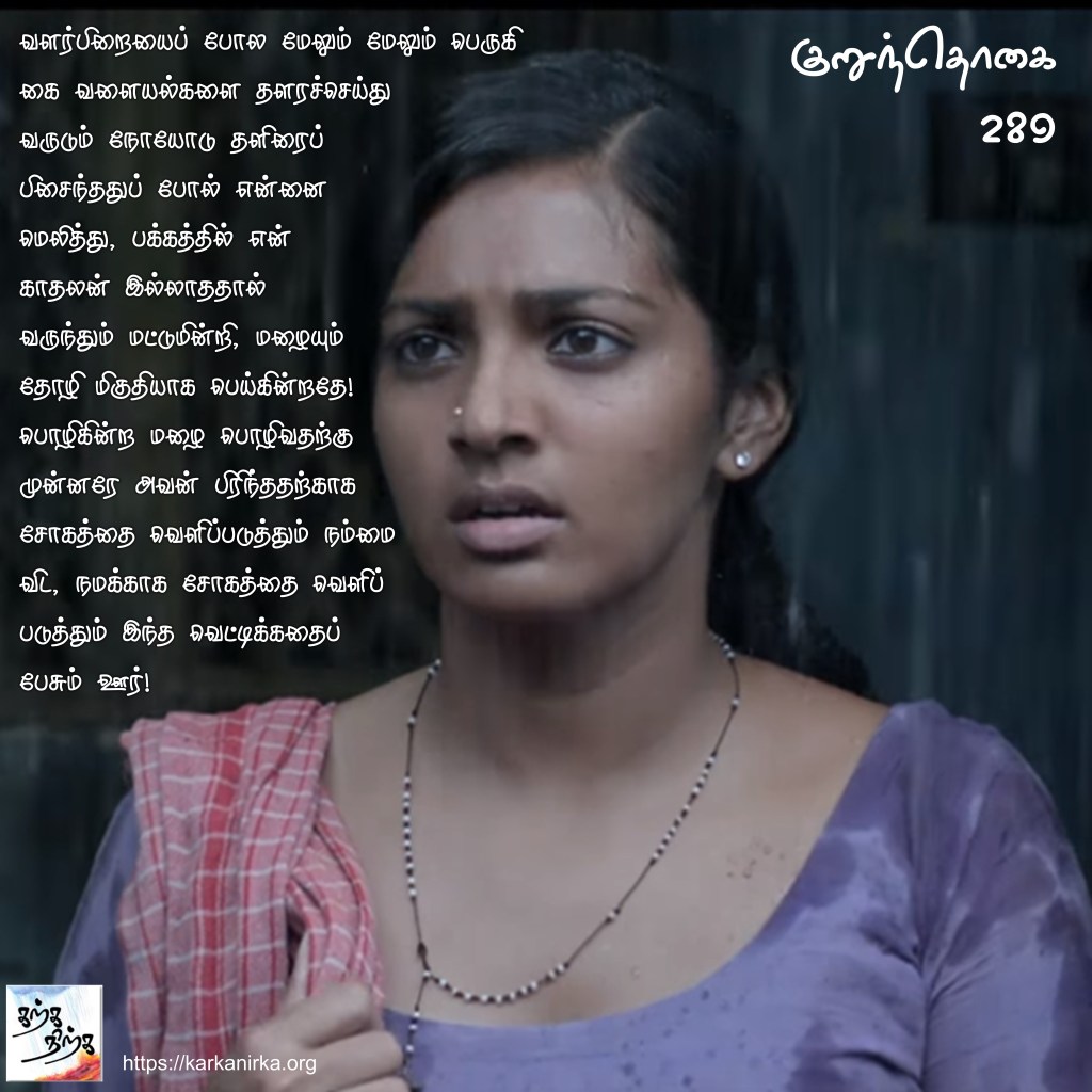 Situation: Thalaivan (hero) is in love with Thalaivi (Heroine). He has left her to earn wealth and promised to return by monsoon season. Village has started a gossip on his delay. Thalaivi utters this poem. #MEMEthokai #karkanirka