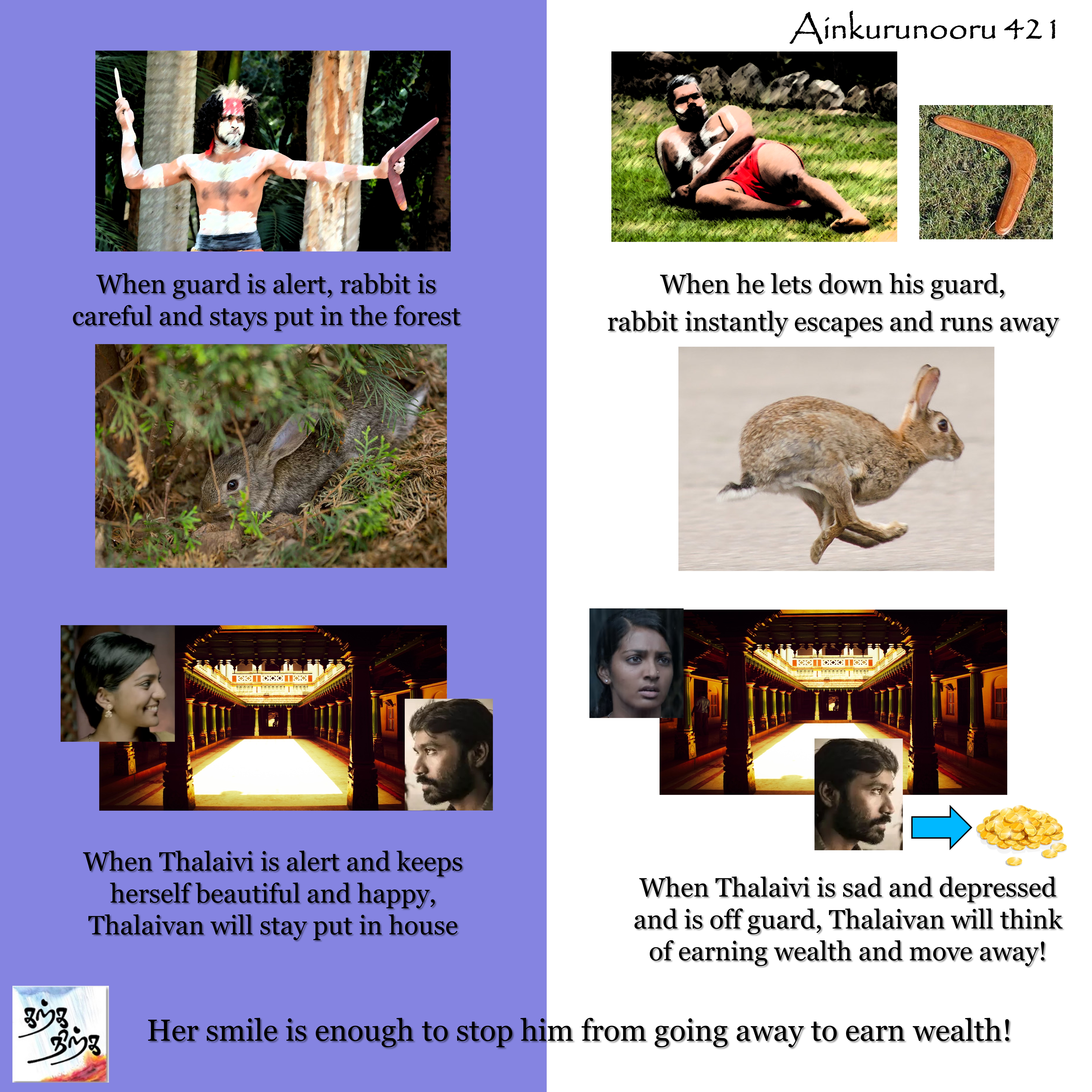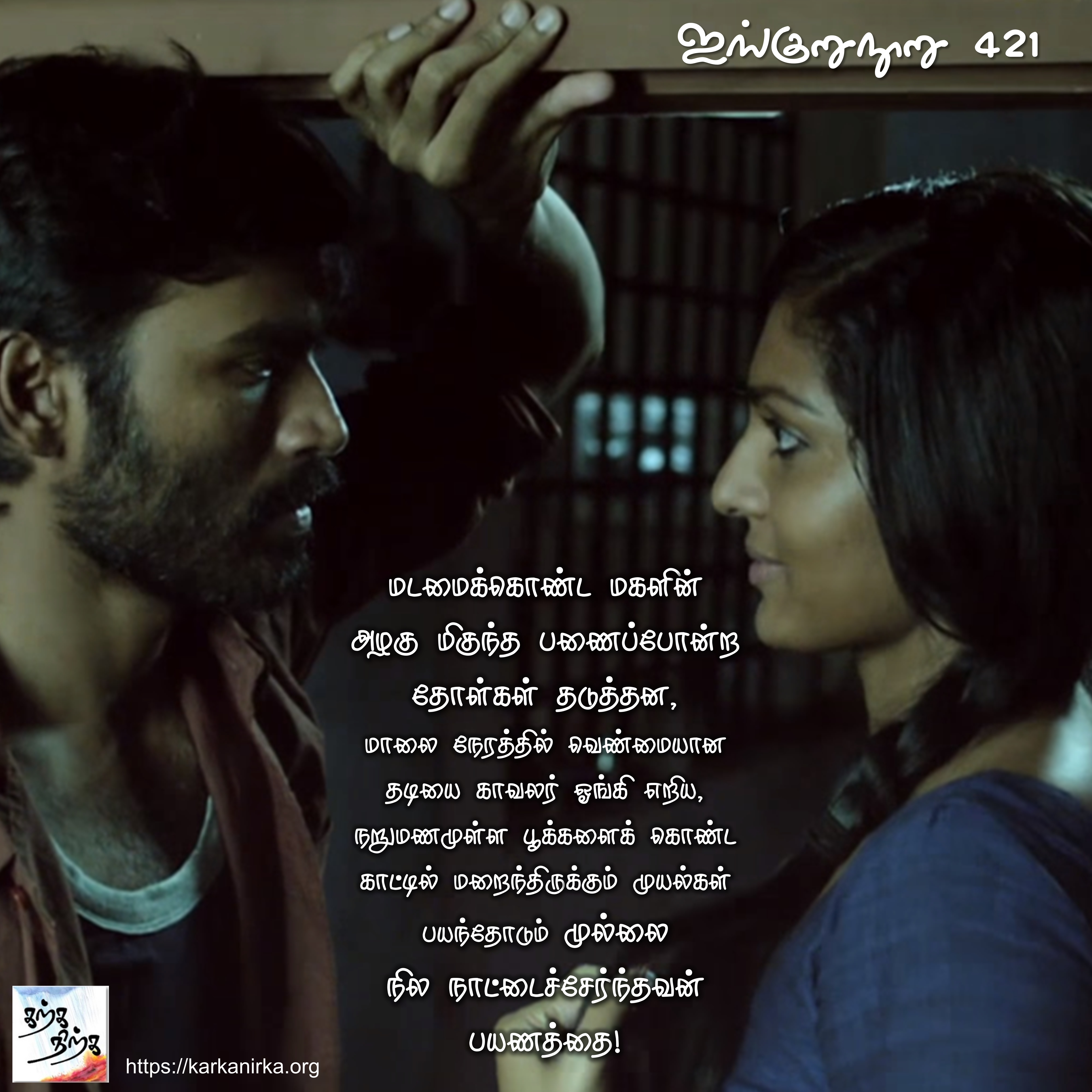 Situation: Thalaivan (hero) is preparing to depart to earn wealth, leaving his lover (Thalaivi) lonely. Thalaivi has other plans.#MEMEthokai #Karkanirka