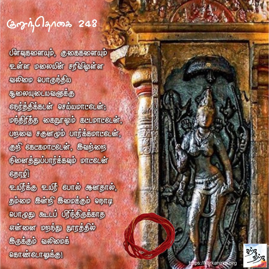 சூலி – cūli – can be a pregnant women or Sulin with Trishul. Most likely in context it is goddess with Sulam. Interestingly Sangam doesn’t have reference to Shiva with trident.